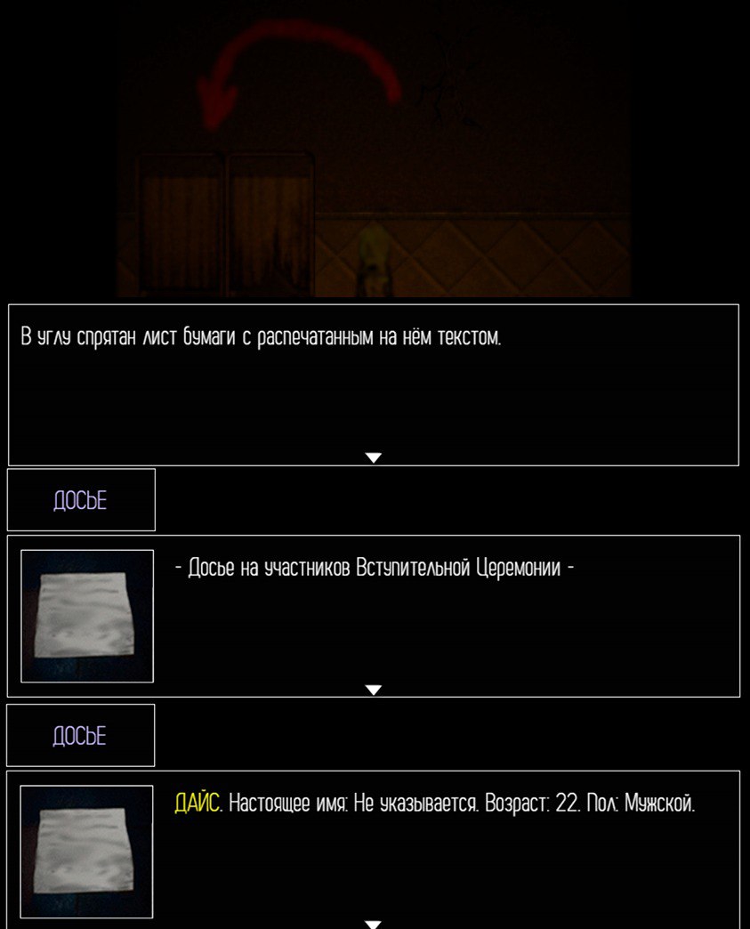 Забыл упомянуть. Капо - главный герой, он не носит маску, как остальные, а носит балахон. Дальше мы играем за него, игра наконец-то передаёт нам управление персонажем. Гг читает записку со стены, где расписаны правила церемонии. Из них мы узнаём что участникам запрещено раскрывать свои лица и свои настоящие имена, делиться подробностями своих настоящих жизней