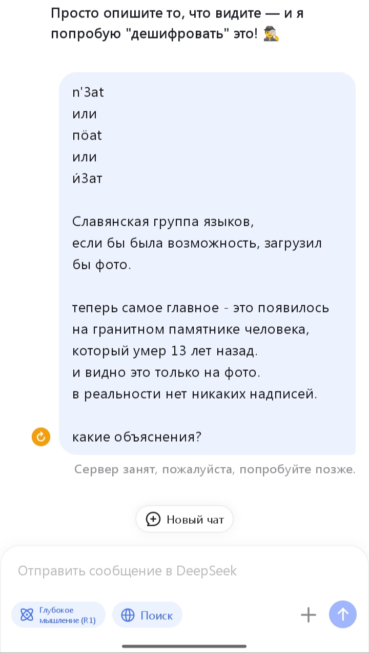Разные режимы съемки/обработки: Попробовать сделать фото еще раз в разное время суток, с разным освещением и разными настройками камеры (если возможно). Если символы проявляются по-разному или не проявляются вовсе, это может указывать на особенности материала надгробия и его взаимодействие со светом. Обработка фото в разных программах: Открыть фото в нескольких графических редакторах и попробовать применить разные фильтры, уровни, контрастность. Возможно, это поможет выявить скрытые детали и лучше понять, что это за символы. Ультрафиолетовый свет: Если есть возможность, попробуйте посветить на надгробие ультрафиолетовым фонариком в темноте и сфотографировать. Некоторые надписи, сделанные специальными составами, проявляются только под УФ-светом. Использовать программы для анализа изображений: Существуют программы, которые могут анализировать изображения на предмет скрытых надписей или водяных знаков. Можно попробовать использовать их. Микроскоп/лупа: Внимательно осмотреть место, где проявились символы, через лупу или микроскоп. Возможно, там есть какие-то микроскопические трещины или неровности, которые выглядят как символы на фото. Если “ньзать” наводит на мысли о “знать” или “назад”, можно попробовать подумать в этом направлении. Может быть, эти слова как-то связаны с жизнью отца или с тем, что было закопано вместе с ним?