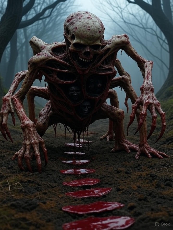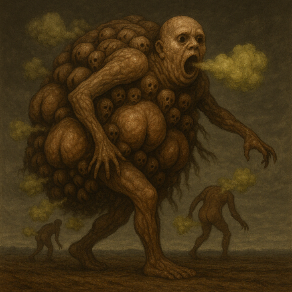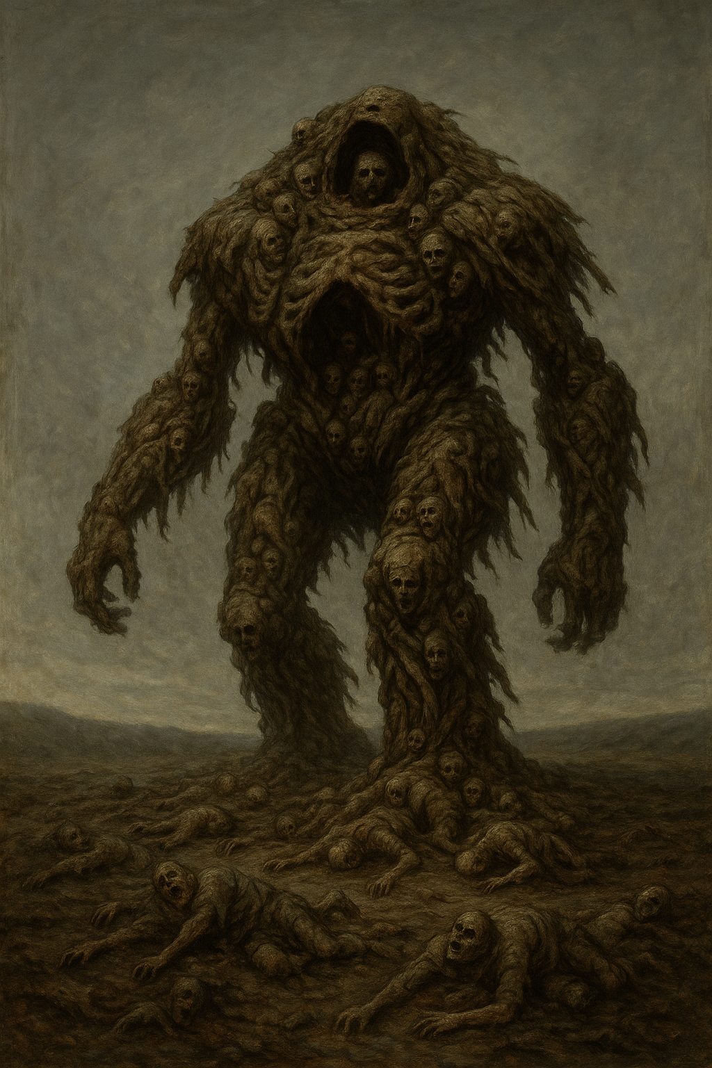 Я не знаю, как начать. У меня нет ни доказательств, ни слов, которые могли бы объяснить это… существо. Но если вы услышите шаги — ровные, медленные, будто кто-то меряет землю — бегите. Не оглядывайтесь. Я работал тогда недалеко от бывшей деревни, что давно стерта с карт. Сначала всё было тихо — слишком тихо. Даже ветер не шелохнул траву. Птицы молчали. А потом я заметил, как земля… дрожит. Едва заметно, будто внутри что-то ворочается. Показалось. Так я подумал. Но на следующий день я увидел его. Оно не шло — оно двигалось собой. Целиком. Гора из тел, связанных, вросших друг в друга. Не зомби, не монстр. Больше похоже на памятник, что сбросили с пьедестала, и он пополз. Тела не были мёртвыми — точнее, не совсем. Они были использованы. Как кирпичи, как мясо для чего-то большего. Лица — сотни лиц — глядели во все стороны. Некоторые двигались, как будто пытались говорить. Другие просто смотрели. На меня. Я застыл. А оно всё шло. Медленно, но безостановочно. Я видел, как внизу его плоть расползается, сливается с землёй. Там, где тело рвалось — наружу вылезало новое. Иногда не целиком — только рука, нога, половина головы. Оно не страдало. Оно заменяло себя. И шов у него — это не шрам, это сплетённые кости. Не человеческие. Я видел позвоночник, в который встроен младенец. Просто как элемент конструкции. Как замок в стене. А рядом — лицо в военной каске. Я узнал его. Это был мой брат. Погиб десять лет назад. Я похоронил его сам. Он смотрел, не двигаясь, но я чувствовал — он знал меня. Оно знало. Я слышал шаги ещё до того, как увидел его. Тихие, как биение сердца земли. Потом всё громче. Сначала во сне. Потом наяву. Этот ритм… нельзя забыть. Как метроном для мертвецов. Я убежал тогда. Спотыкался, выл, плевался грязью. Когда обернулся — ничего не было. Ни следов, ни запаха. Только ощущение, что оно всё ещё где-то рядом. И не стоит на месте. Оно не разрушает — оно движется, поглощает, вбирает. Всё, что встречает. И я боюсь, что однажды оно придёт туда, где живут люди. Не для того, чтобы убивать. А чтобы продолжить путь. Я не знаю, как это остановить. Может быть, никак.