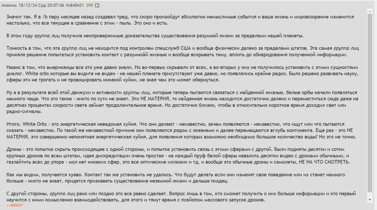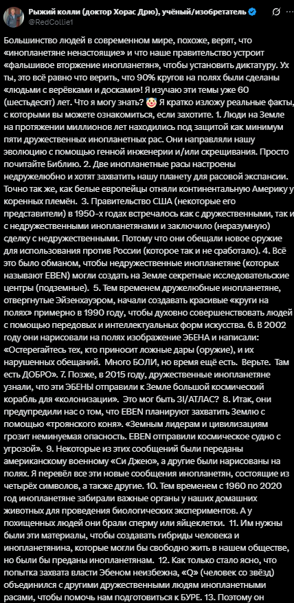 >>865628 Якобы существует план по постепенному раскрытию информации. Документы, упомянутые в Конгрессе, — это те, что Кнапп привез из Советского Союза. Кнапп — мошенник и лжец. Зачем вам нужны российские документы, если есть люди, которые говорят, что работали с НЛО и пришельцами?! Так что это либо психоперация, либо честное постепенное раскрытие. Также говорят о чем-то в 2027 году. Суть истории в том, что пришельцы создали нас и поместили сюда, и поэтому раскрытие информации не происходит. Религии это не понравится. Интересно, что будет, если Россия или Китай выйдут и скажут, какова правда.