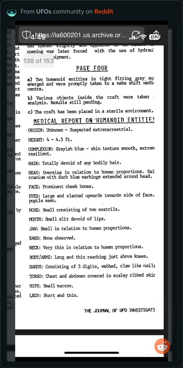 И как мы можем из раздобыть? Тела инопланетян нам не увидеть и с живыми не пообщаться. В этой теме с инопланетянами с фактами и доказательствами большие проблемы, приходится иметь дело с тем что нам доступно. Но ведь НЛО терпели крушения и там были трупики, это по логике понятно что если существование НЛО с каким-то разумом в нём это факт то и тех кто внутри этих НЛО сидит тоже люди видели и как-то общались с ними хоть один раз за всю историю.
