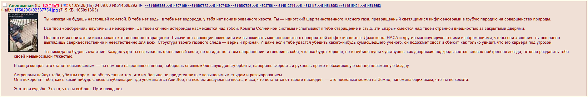 >>864514 Да это знаю. Тема вскрыта - я конкретно про назначение кругов как творение иного разума, и что оно не несет каких-либо зашифрованных посланий, которые искали некоторые, а является просто искусством, как очень простой способ обозначить свое присутствие и разумность без прямого контакта или применения хитровыебанных схем и шифров как на вояджерах и пионерах (хотя это плохая аналогия, сами по себе АМС уже творение разума). А по шумерам и прочим мифам лревних и не очень цивилизаций - я уже много лет ИТТ, все читал, да и в 90х ребенком поглащал всякие брошюрки по проектам Блю Бук и всяким авибазам Эндрюс - короче давно в теме, тут конкретно кто-то высказал мысль про послания в кругах - на что я озвучил мысль что нет там никаких посланий, просто искусство.
