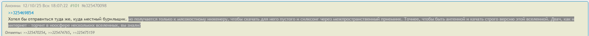 Только что вернулся с работы. Много не постил. Больше читал. >>867224 Это явно ощущение бурения. >>867280 Надеюсь нет. >>867283 Ты кто? >>867284 Межмирового бура тред. Появится в /b/ в первые минуты субботы. Уйдет в ночь с воскресенья на понедельник. Это тред в котором бурят в другие миры. Никто не бурит кроме немногих. Я бурю. Без особых успехов. >>867286 Не Крутитель. Не похож. Я бурюсь неделями не видел ничего похожего. Значит слабо бурюсь. Буду бурить усерднее. Почему у них получается а у меня нет?