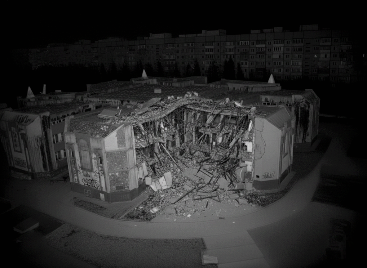 1. Сон начинается с того, что я стою посреди небольшого поля около самой школы. Вокруг тьма, освещения толком нет даже от луны (потому что и самой луны-то нет). Но у самого в руках фонарь, который более-менее достигает силуэтов стоящих рядом домов. Всё пространство рядом будто бы в моменте перестало быть "живым". Дома, в т.ч и мой, будто давным-давно брошены, но благополучно оприходованные вандалами. Граффити то там то тут, стёкла естественно выбиты, где-то окна просто заделаны фанерой. Ну короче типикал заброшки. Собственно, и сама школа в таком же состоянии, но по внешнему виду она не сколько брошенная, а скорее недостроенная. Будто её и в эксплуатацию не вводили никогда. Ну я начинаю продвигаться вперёд. Лучом света фонаря задеваю свой дом, осматриваю его, но двигаюсь через поле в сторону школы. Вокруг всё темно, но темнота не ночная, а будто весь микрорайон находится в огромном, бесконечных размеров ангаре. Везде пыль, грязь, всякие тэги и граффити. Так я захожу на территорию школы, наблюдая следующую картину: один из входов в саму школу, где находился вход в её часть где были кабинеты младшеклассников, обрушен. Обрушен так, что видно всё что находилось внутри. Ну я по этой груде забираюсь и прохожу дальше, выходя к главному "холлу" школы. Уже там, соответственно, нахожу стоящего посреди темноты одноклассника. Без какого-либо страха или лишней мысли подхожу и спрашиваю его, а че случилось-то. Он мне спокойным голосом и говорит: в школу прилетела бомба. На этом моменте я резко проснулся