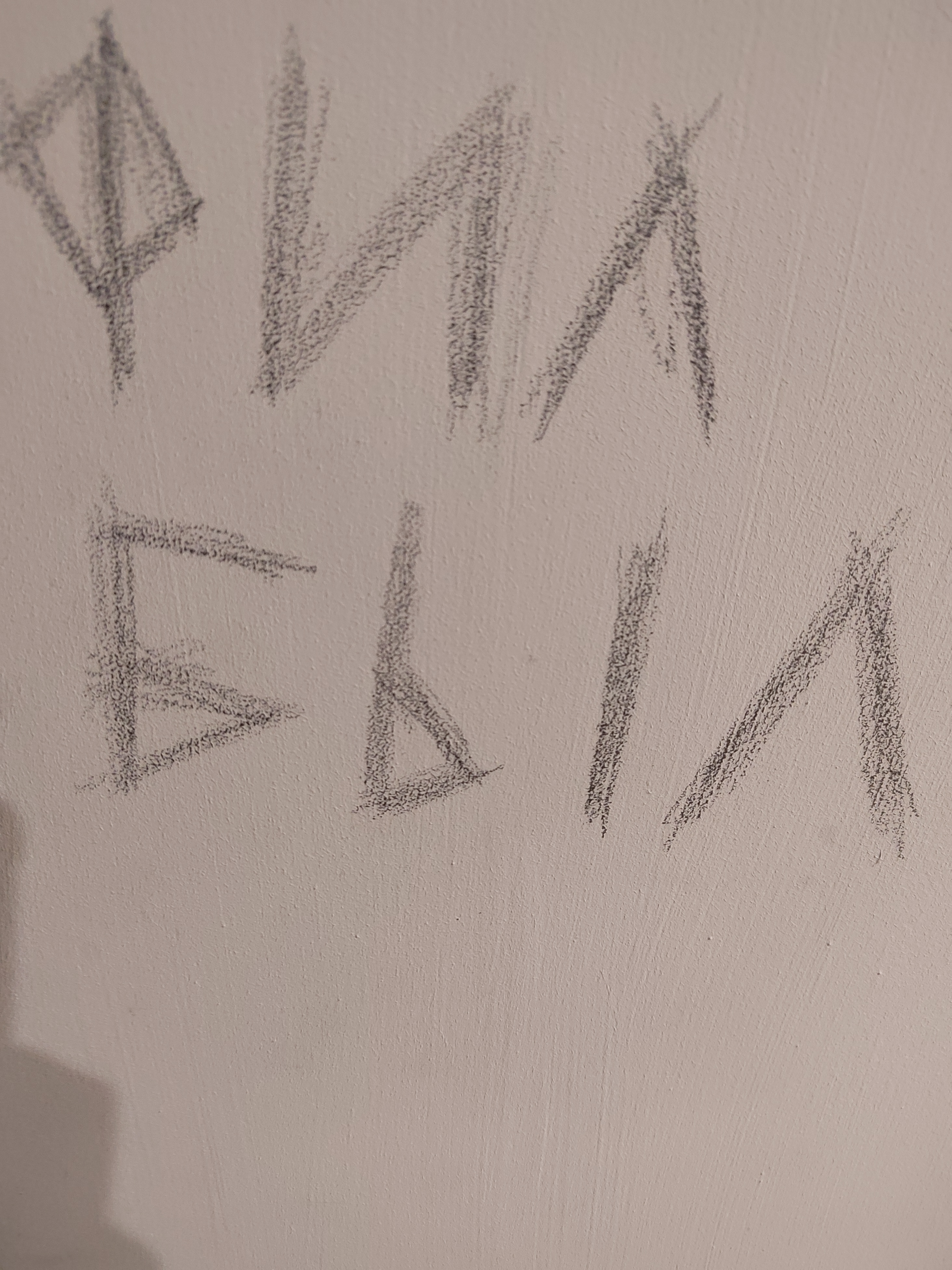 >>871571 Карандаш какой-то. Может что-то угольное. Дверь и дверной проём всё же немного разные предметы? У букв написание такое, что их не выводили, а черкали. Все штрихи прямые.