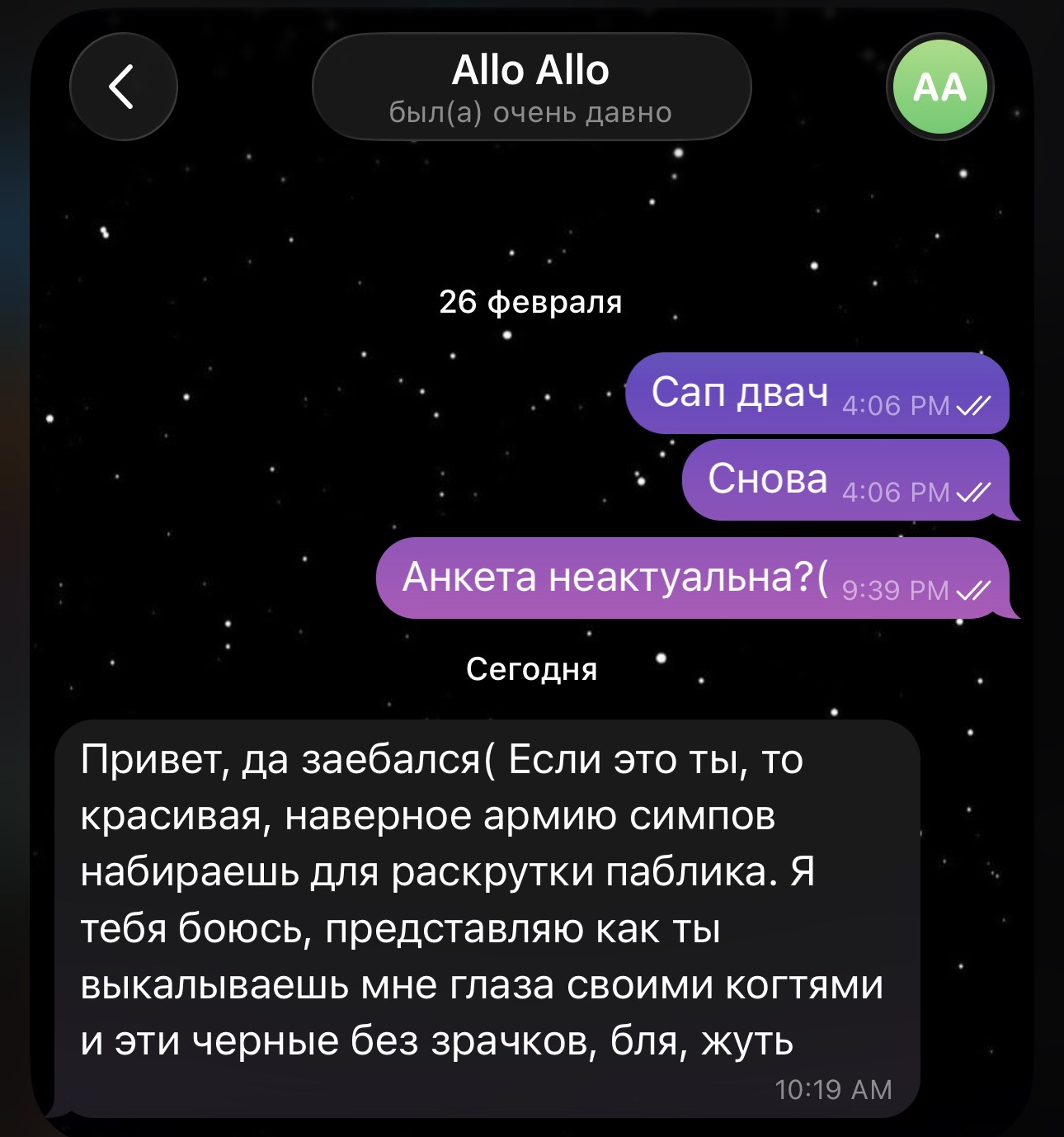 - Спам анкетой (не чаще 1 анкеты в сутки);