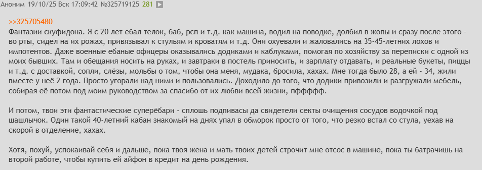 А касательно > стареющая б/у порванка будет отдельный комментарий: стареющий, скуфеющий мужик без интересов и целей на жизнь с нестоящей бибой ценится примерно так же.