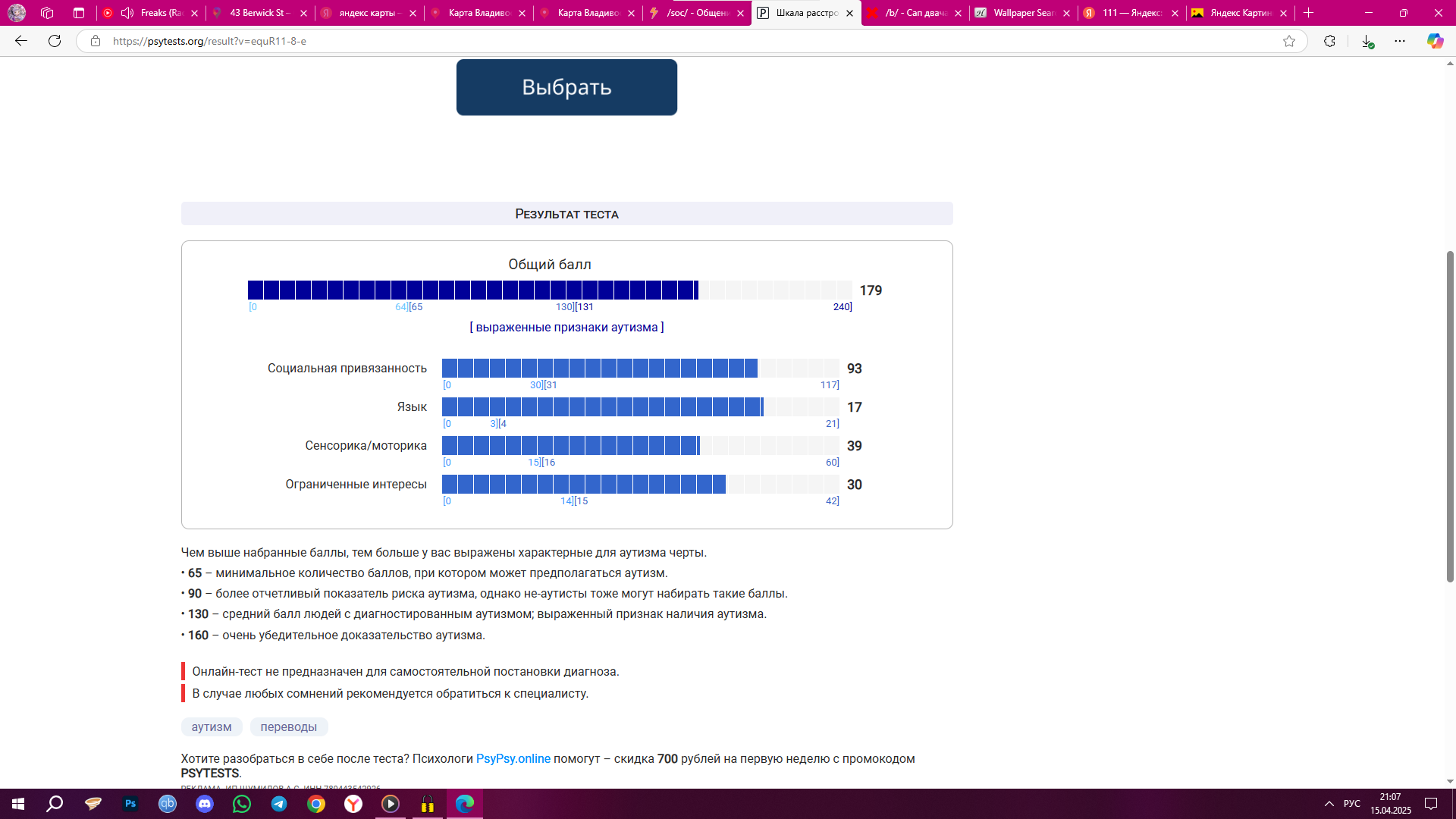 >>7312192 Этот тест создан для прохождения в клинических условиях. Для меня, например, вопросы были слишком абстрактны, или не мог ответить однозначно, или не получалось вспомнить конкретные примеры, но казалось, что было. Поэтому для точности надо проходить со специалистом.