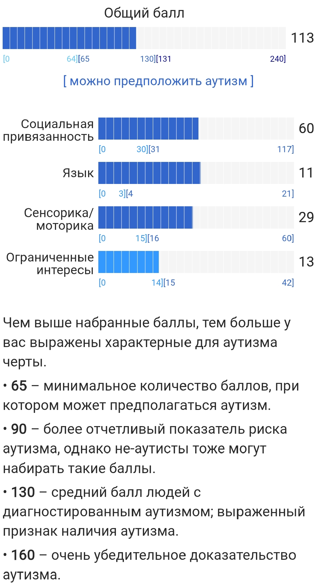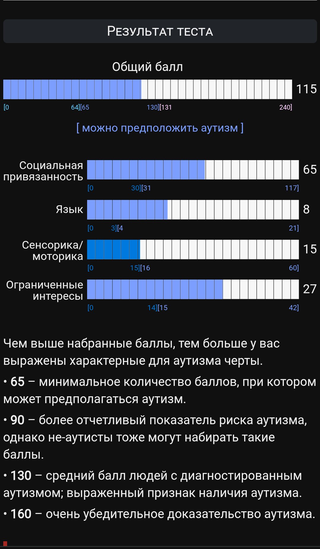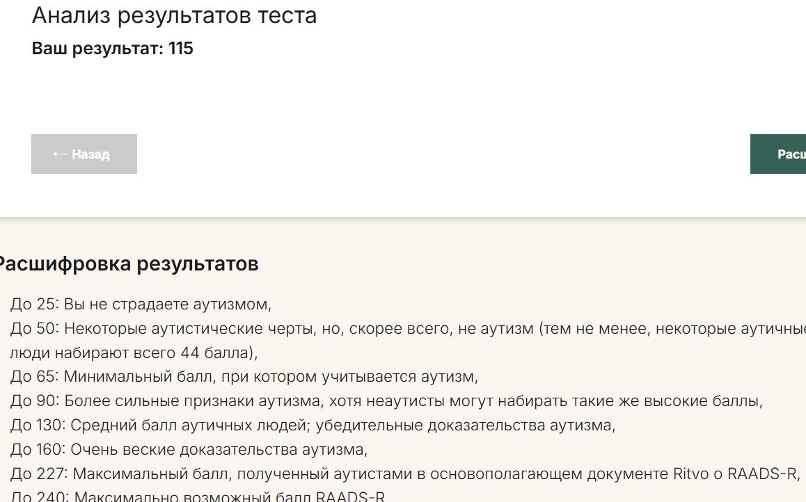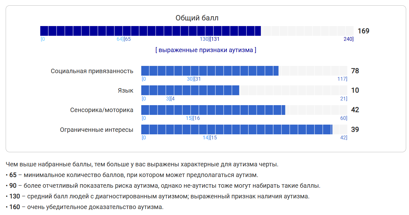 >>7246778 (OP) Общий бал 142 это вообще много? Я никогда не думал что у меня может быть аутизм, типичных признаков типа непонимания метафор, буквального восприятия сказанного, монотонной речи и движений, очень узкого круга интереса и подробного в них погружения у меня нет.