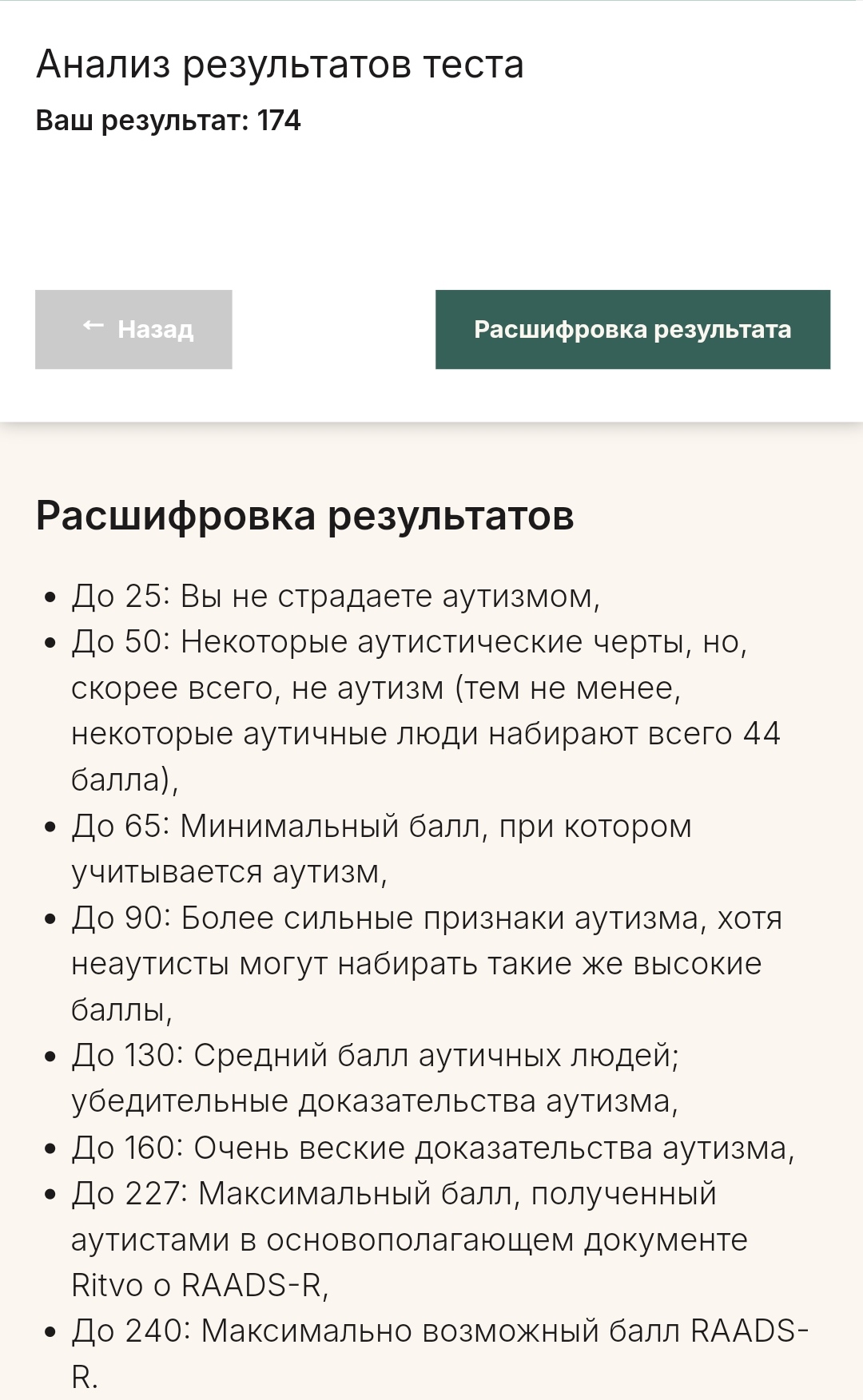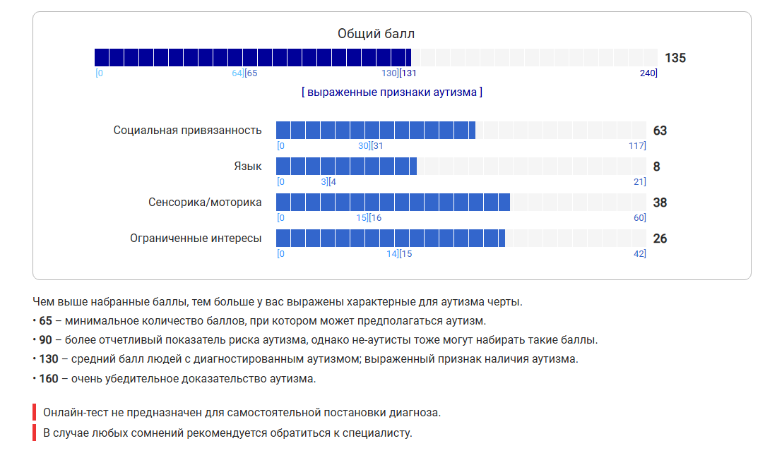 Главный показатель моего аутизма - это количество раз, когда я задавался гневным вопросом, почему нет более подробного деления на "частично", "иногда" и тому подобное. Контекст не учитывает!!!1! Очень категоричные вопросы, на которые сложно ответить, потому что замечаешь за собой описанные черты, но не всегда. Или похожее на правду, но не для каждой ситуации. Или ситуации представленные очень форсированные. Любой общий тест - обобщён по определению, но тут совсем рельсы какие-то.