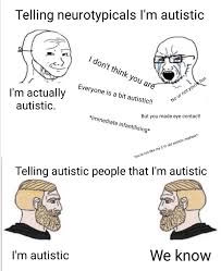 >>7246986 > И нету тут среди вас аутистов Дай своё (которым пользуешься) определение аутизма, и назови критерии постановки диагноза, и что надо сделать, чтобы убедиться, что человек аутист.