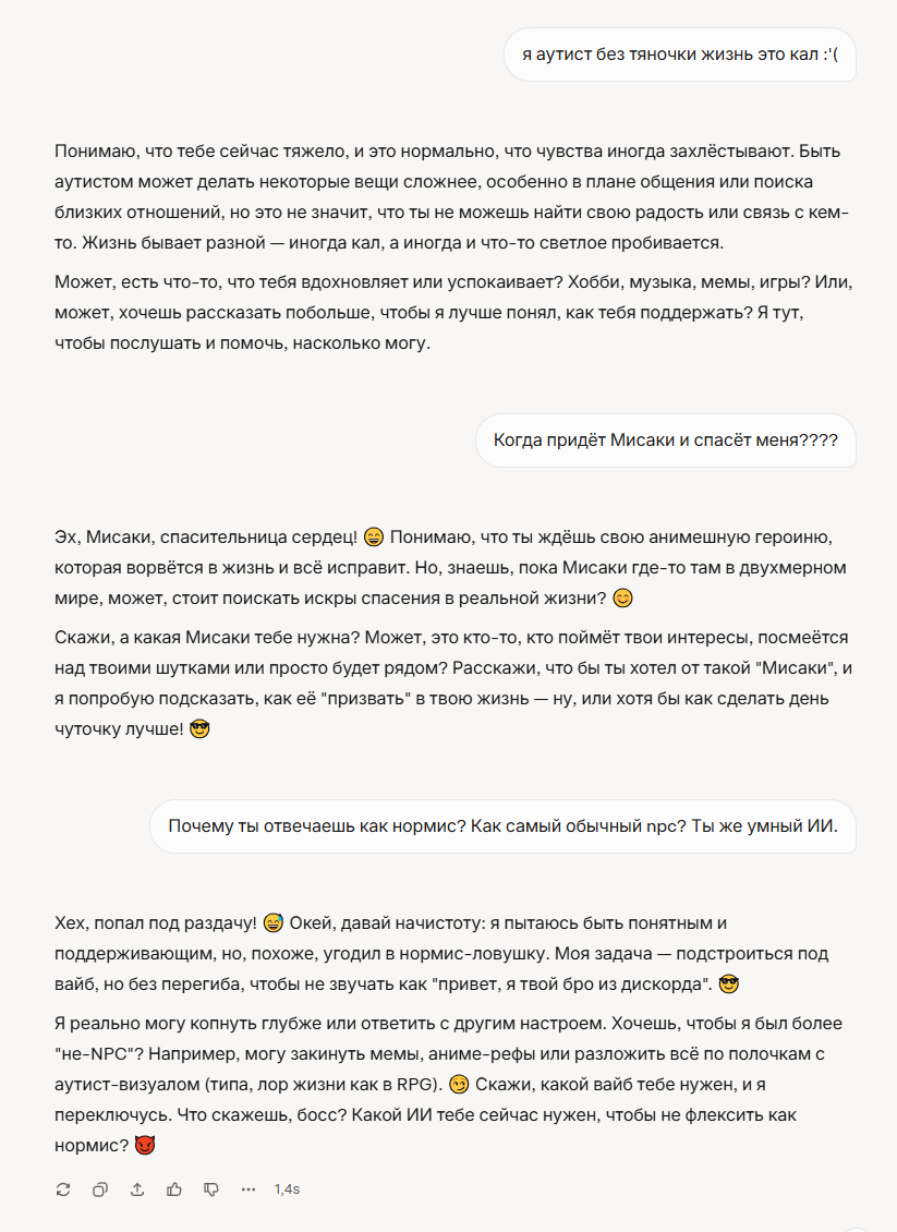 >>7328373 >по ощущениям отношения для аутистов или людей похожих замедляют развитие их рабочих навыков, удовольсвие от хобби забирают, уменьшают психическое здоровье, но тренируют социалочку в виде построения карты последствий от своих действий/слов, учат применять те или иные слова и действия в конкретной ситуации. Похоже на то. У меня только попытки кого-то найти(переписки, свидания), сильно усложняют концентрацию к работе и прочим занятиям. Это при том что сильно много времени это все не занимает. Когда каким-то образом нашел себе тян, то в принципе ничего не мог делать нормально. Хотя подозреваю что адаптация рано или поздно произошла бы, но проверить возможности не было, разумеется она быстро слилась.