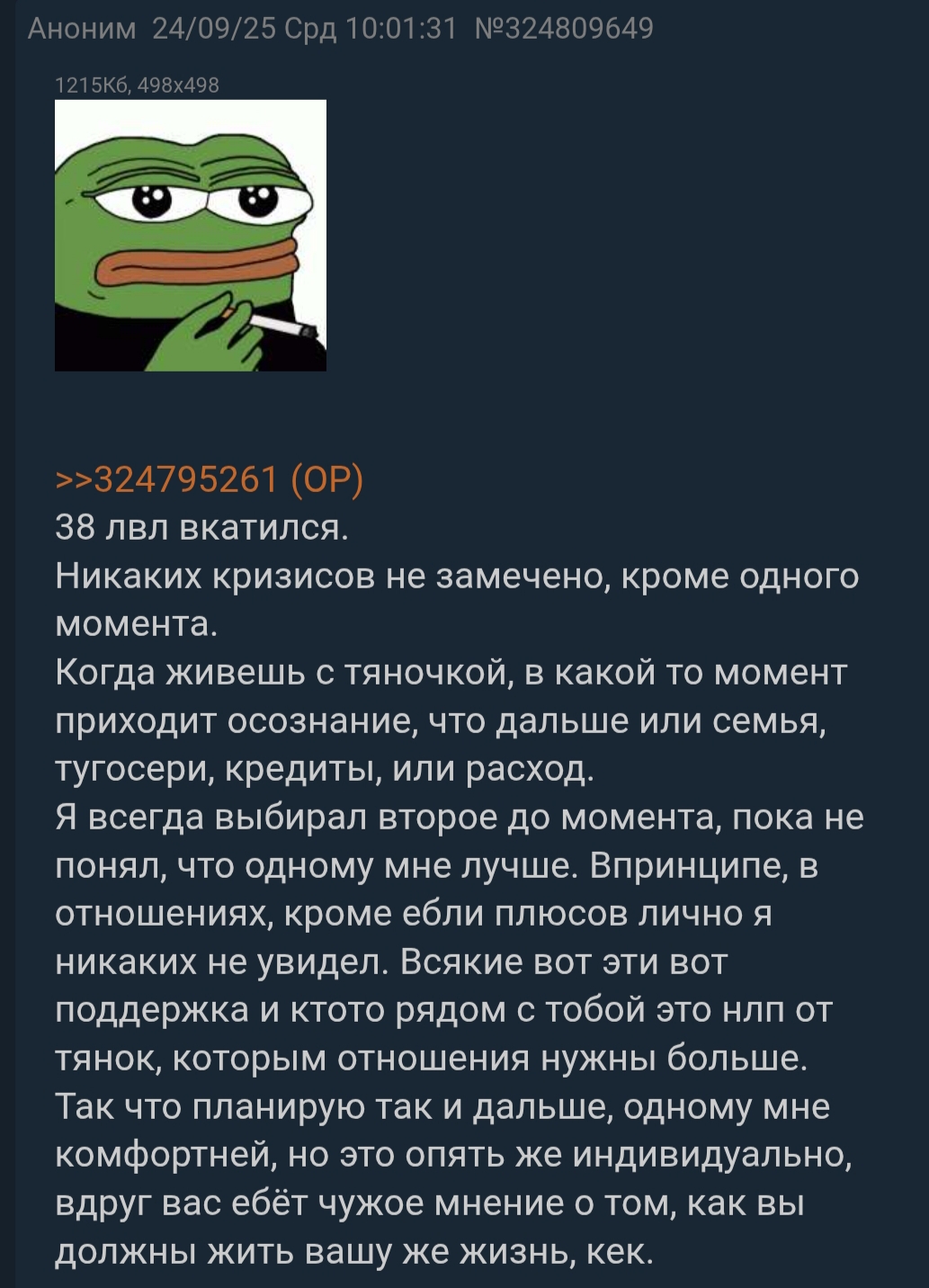 Бля какой кринж, без обид. Куколдизм какой-то, мне искренне жаль от чтения таких историй. И в этой ситуации нет виноватых, только какое-то недопонимание между людьми и их чувствами к друг другу. Восхищаюсь тобой если ты действительно не чувствуешь никакого разочарования и даже обиды, это говорит о стойкости характера. Меня бы разорвало изнутри от такой ситуации, но я бы и не пошел к дому тян, наверное. Ну если бы я предложил, а она не ответила бы. Но и к Лене нельзя предъявить что она не пустила или что даже ебется там с кем-то.