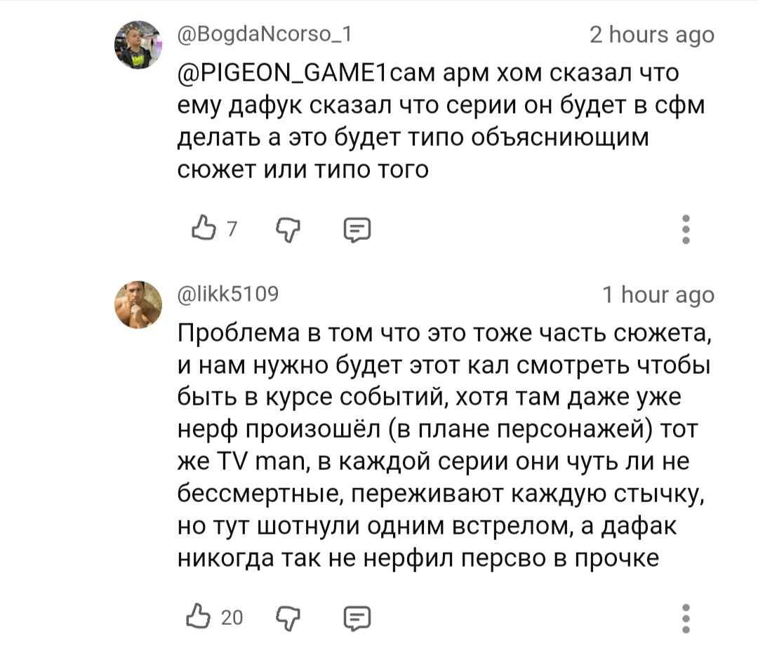Самое печальное — на растерзание была отдана весьма многообещающая сюжетка из оригинального сериала, а значит расследование Детектива-Камерамена (про Секретного Агента), как и все сопутствующие раскрытия лорных тайн теперь будут отправлены в ↓↓сериал-пидор↓↓, и вряд ли станут детально освещаться в рамках каноничного сериала. Лучше бы сделали сериал о каком-нибудь прошлом Вантуз-Мудака — его было бы не так жаль.