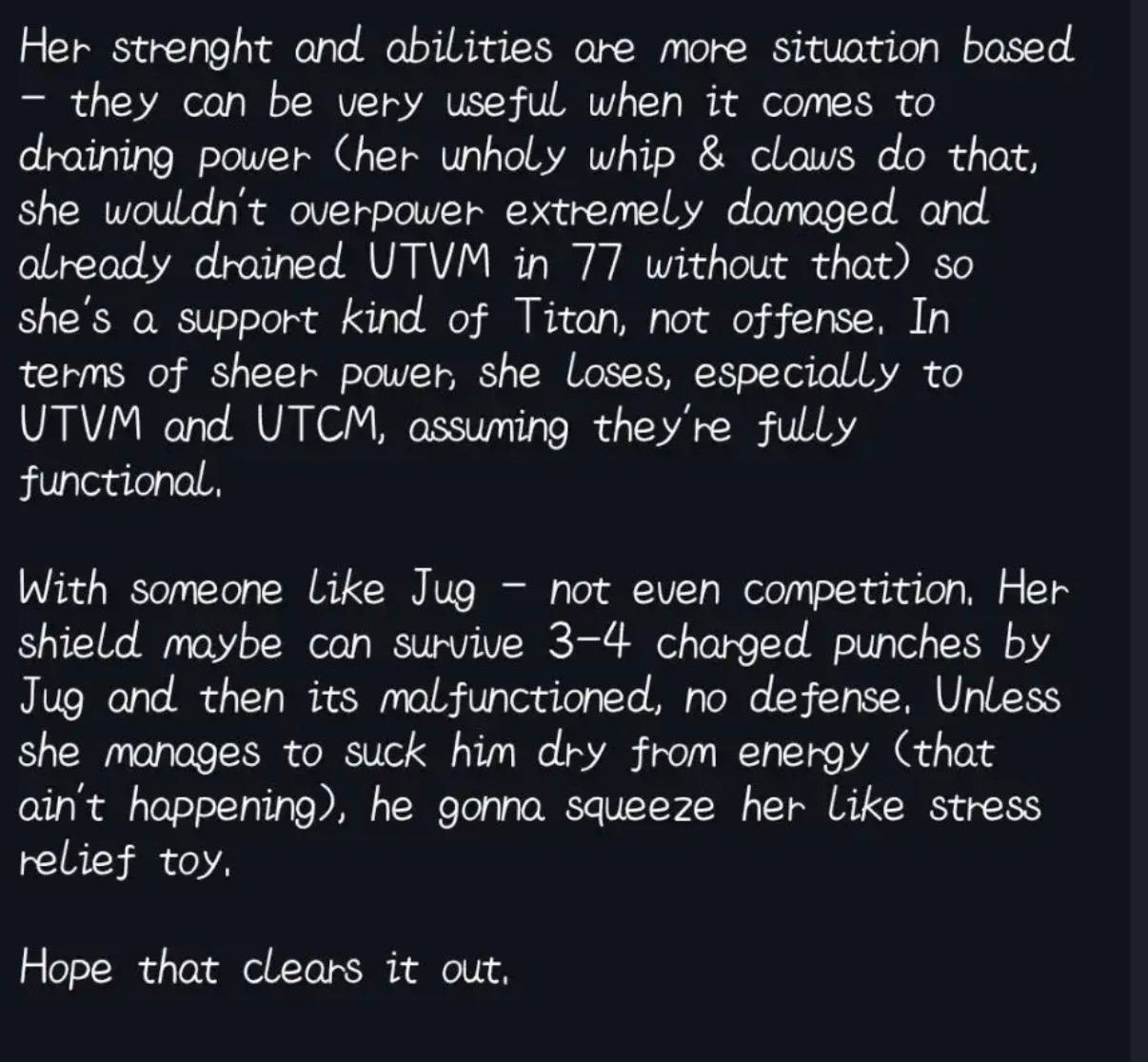 Её сила и способности больше зависят от ситуации — они могут быть очень полезны, когда речь идёт о высасывании энергии (её нечестивый кнут и когти делают именно это, и без этого она бы не смогла одолеть уже сильно повреждённого и истощённого UTVM в 77 серии), поэтому она скорее титан поддержки, а не атакующий. С точки зрения чистой силы она проигрывает, особенно UTVM и UTCM, если предположить, что они полностью функциональны.