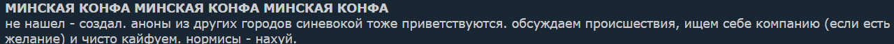 На сходке решили, что конфы в целом не тру и пятое колесо в телеге. Минск альт конфа есть в разделе чатиков и конфочек /ch, но организовываться можно и здесь на дваче. Как в старые добрые времена.