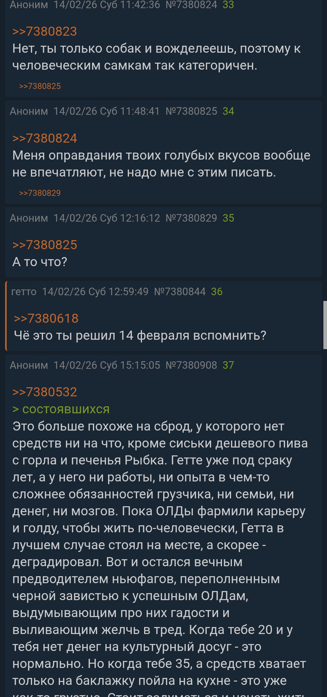 >>7380532 > состоявшихся Это больше похоже на сброд, у которого нет средств ни на что, кроме сиськи дешевого пива с горла и печенья Рыбка. Гетте уже под сраку лет, а у него ни работы, ни опыта в чем-то сложнее обязанностей грузчика, ни семьи, ни денег, ни мозгов. Пока ОЛДы фармили карьеру и голду, чтобы жить по-человечески, Гетта в лучшем случае стоял на месте, а скорее - деградировал. Вот и остался вечным предводителем ньюфагов, переполненным черной завистью к успешным ОЛДам, выдумывающим про них гадости и выливающим желчь в тред. Когда тебе 20 и у тебя нет денег на культурный досуг - это нормально. Но когда тебе 35, а средств хватает только на баклажку пойла на кухне - это уже как-то грустно. Стоит задуматься и начать жить если не по-взрослому, то хотя бы осознанно и разнообразно, не загоняя себя в рамки юношеского нонконформизма и не прикрывая никчемность показным аскетизмом.