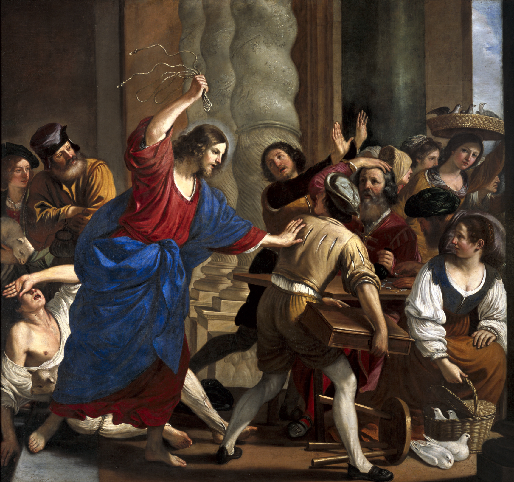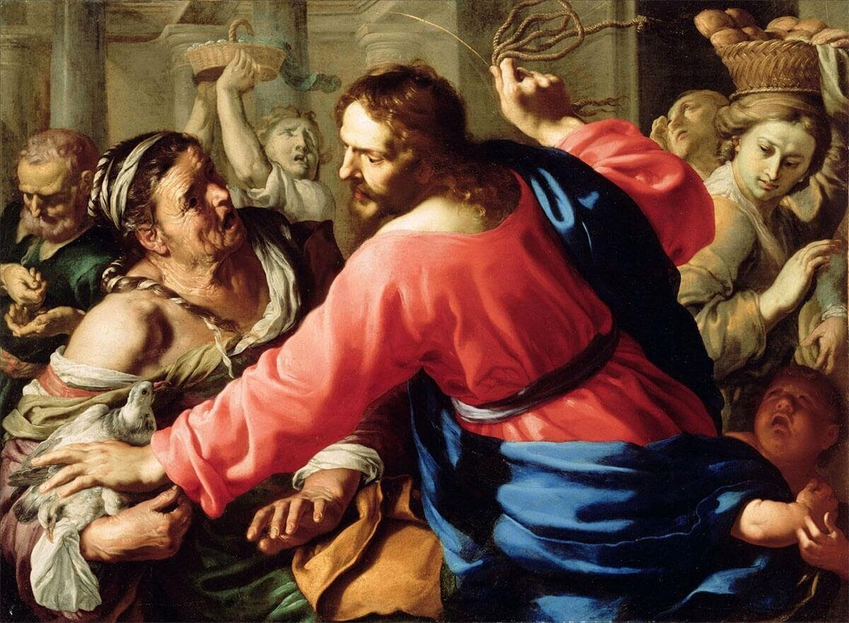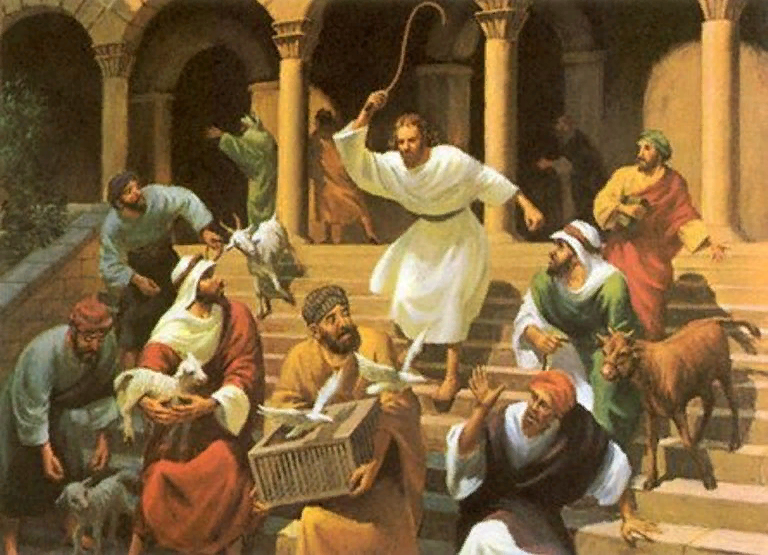 Один из эпизодов его жизни говорит о многом. В Иерусалиме Иисус внезапно взорвался и проявил Себя в ярком, сильном, в огненном эмоциональном действии во время посещения Храма. На празднике Пасхи Он приходит с учениками в Иерусалим. Люди со всего Израиля приходили в Иерусалим в Храм, чтобы принести в жертву Богу жертвенных животных. В связи с этим у входа в Храм устраивались торговля жертвенными животными и всем необходимым при жертвоприношениях. Здесь же располагались разменные лавки. Деньги Рима нужно было обменять на сикли, так как подати в Храм уплачивались только еврейскими сиклями. Когда Иисус увидел у храма торговцев и менял, его это возмутило так сильно, что совершенно вывело Его из Себя. Тогда Он в яростном порыве опрокинул столы менял и торговцев, изгнал их из Храма со словами: