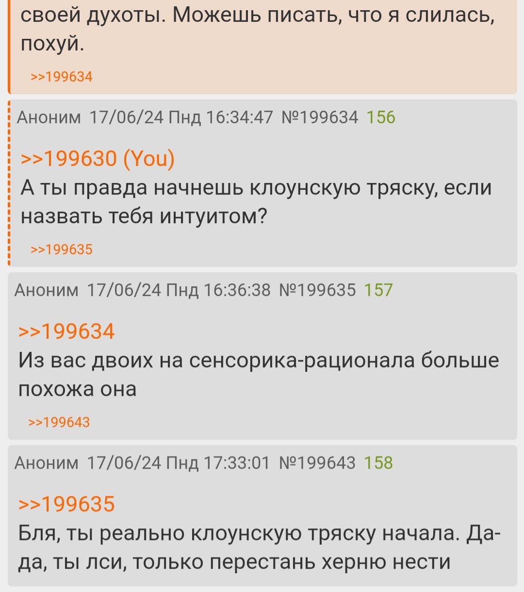 >>199634 Да я сама практически назвала себя интуитом, лол. Здесь >>199587 >Чую пиздеж. Да, записывайте мне сильную интуицию, чую. Еще одно подтверждение, что ты нихрена не читаешь. Алсо, не кидайся на людей, мы тут не одни.
