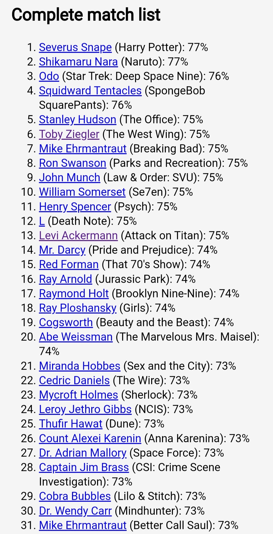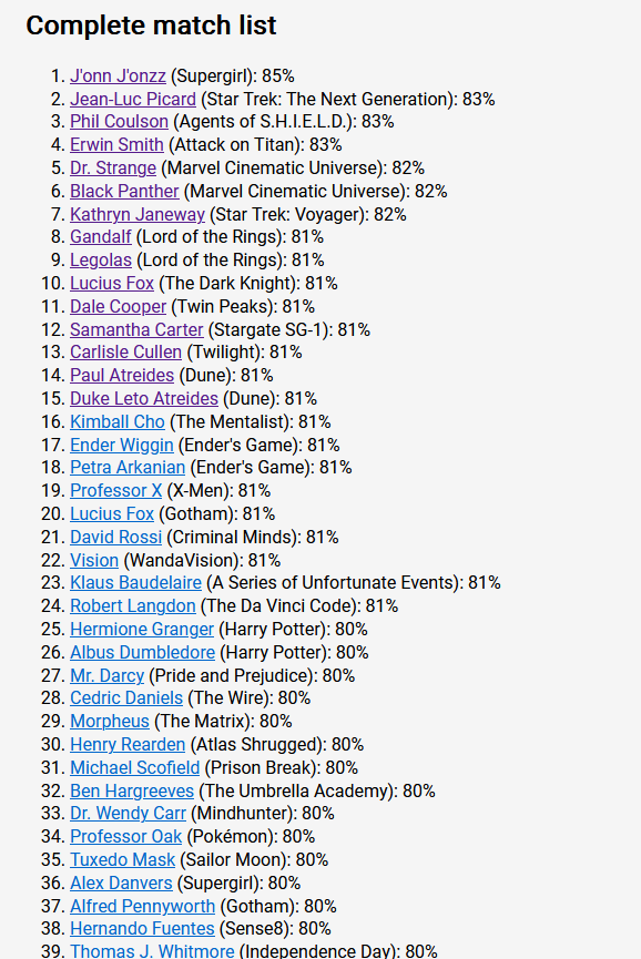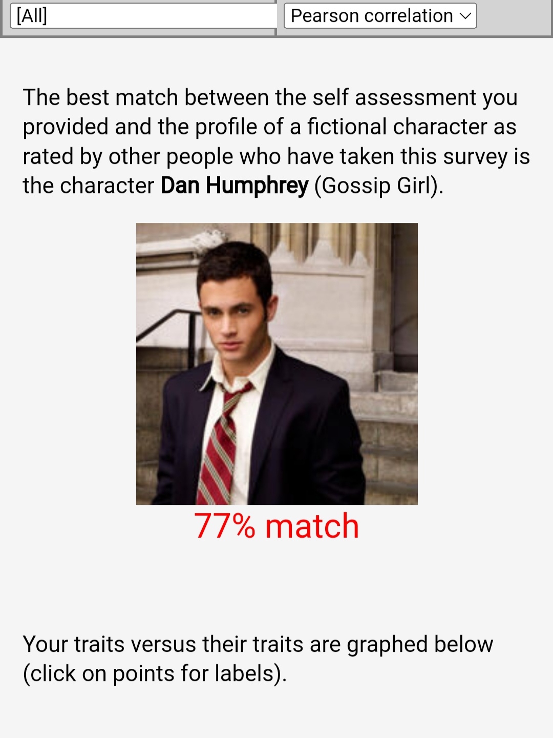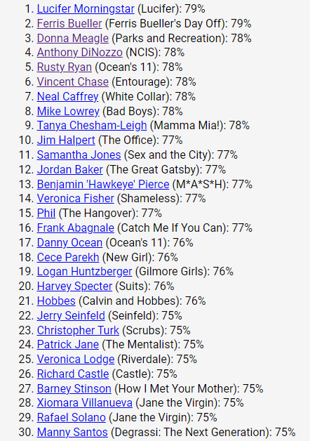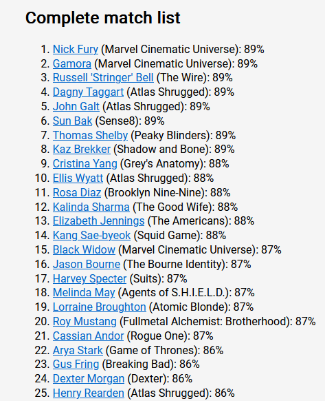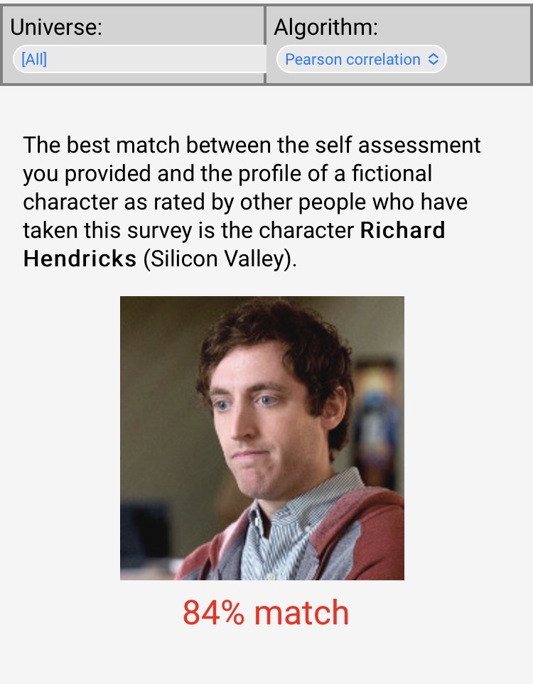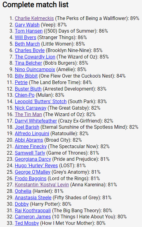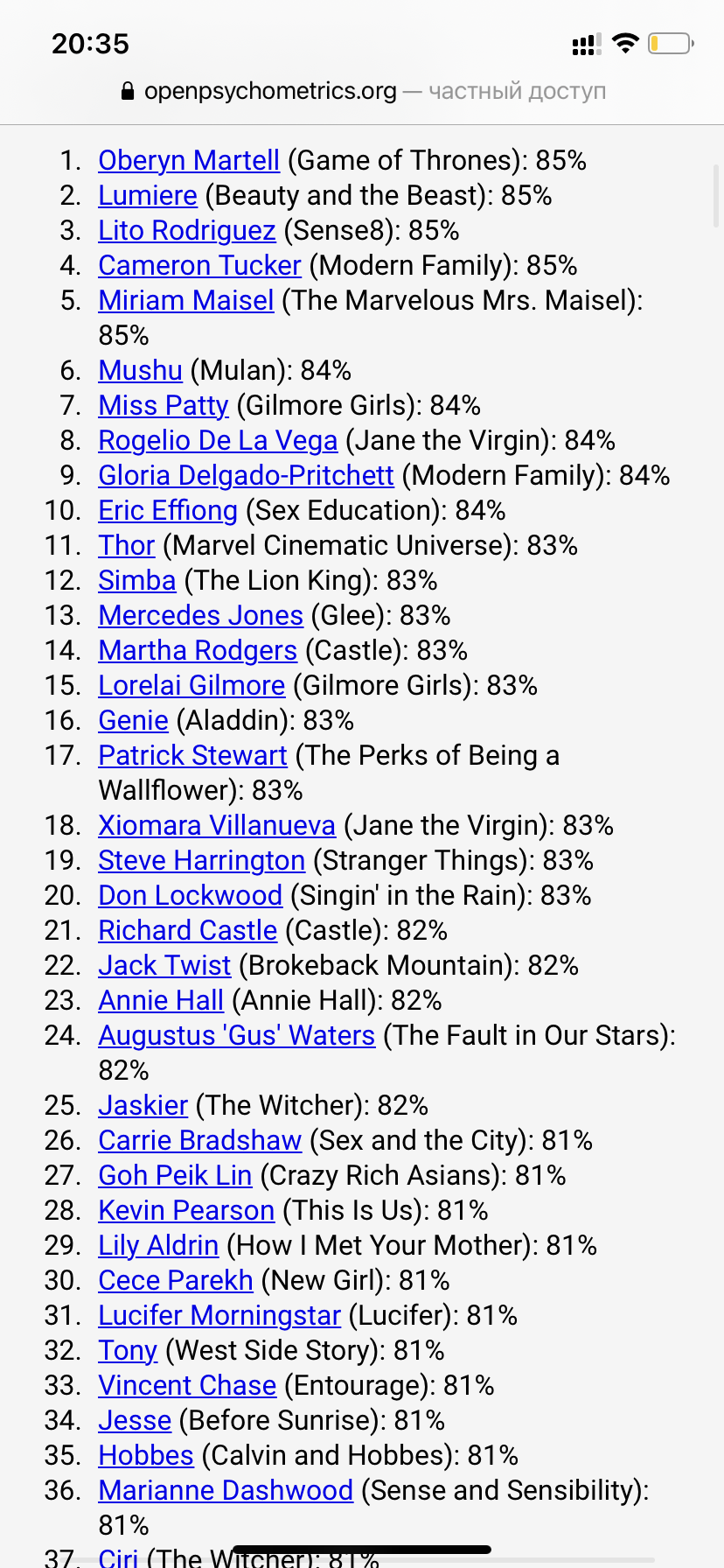 Для теста нужен хороший английский, он по каким-то своим метрикам определяет вашу схожесть с художественными персонажами. (можете выбирать как 36 вопросов, так и 100). Скриньте первые 10 или 20 результатов, будем обсуждать и ловить лулзы.