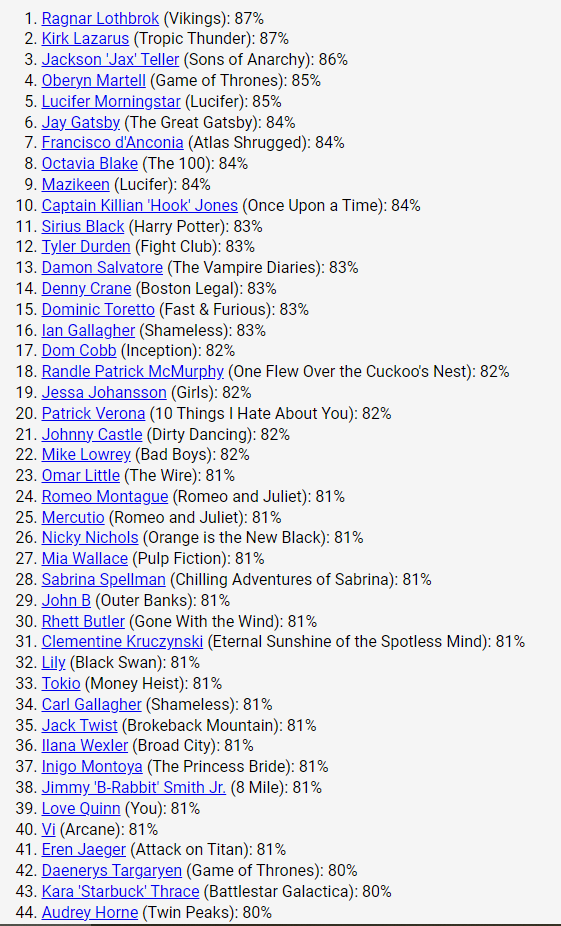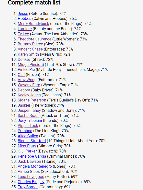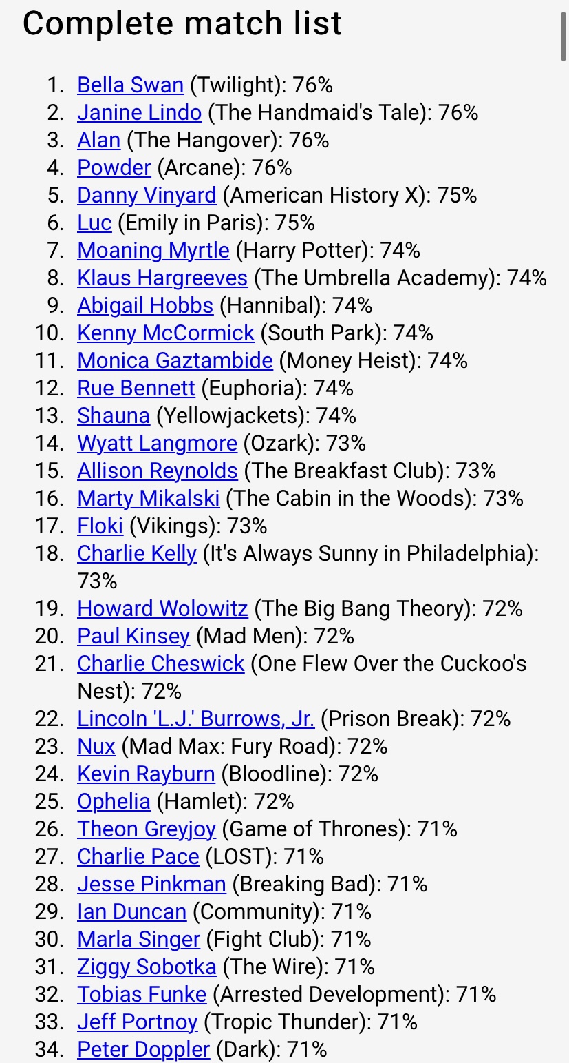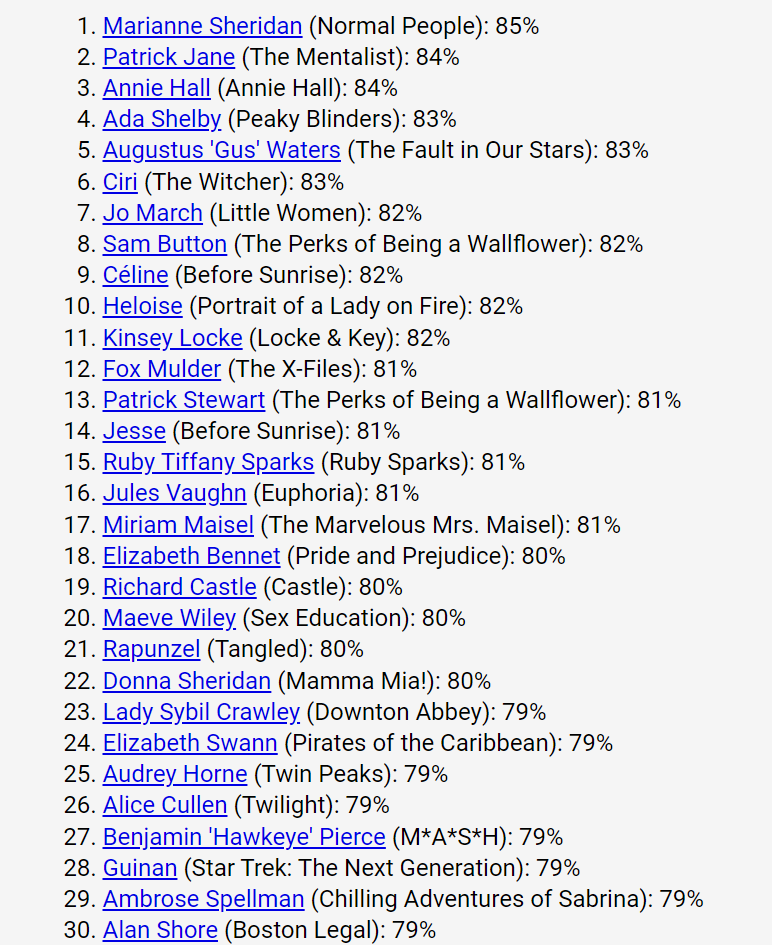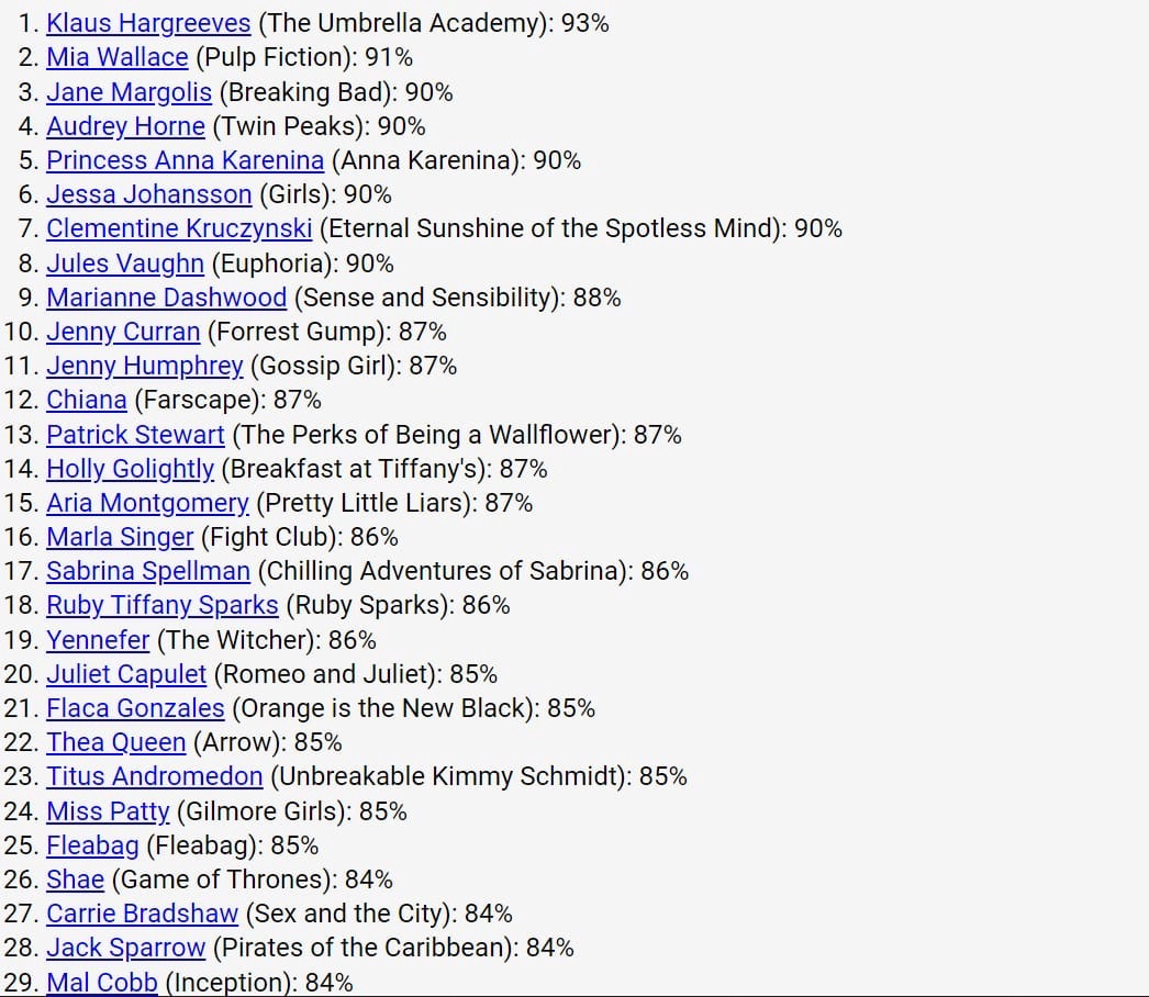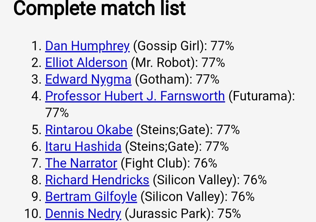 Для теста нужен хороший английский, он по каким-то своим метрикам определяет вашу схожесть с художественными персонажами. (можете выбирать как 36 вопросов, так и 100). Скриньте первые 10 или 20 результатов, будем обсуждать и ловить лулзы.
