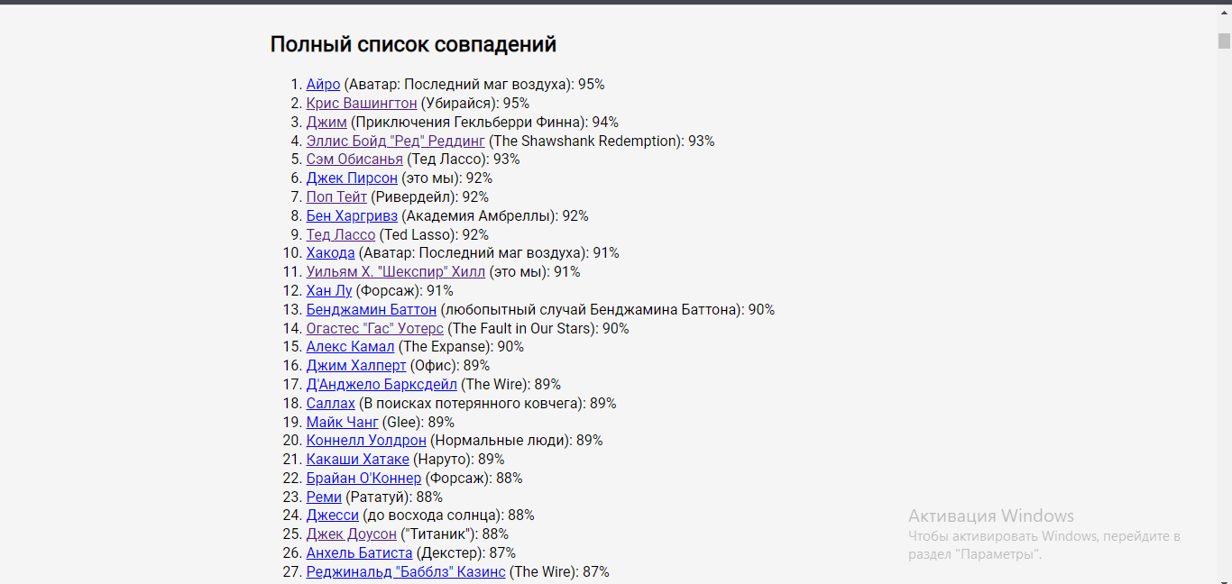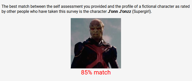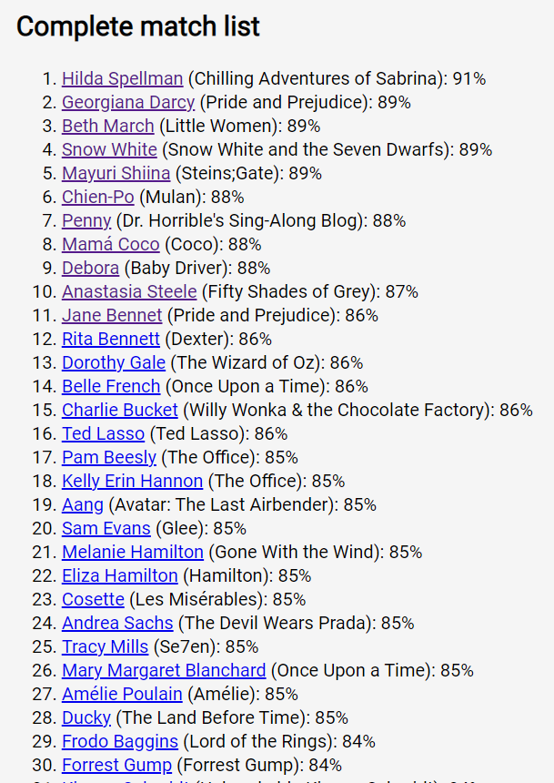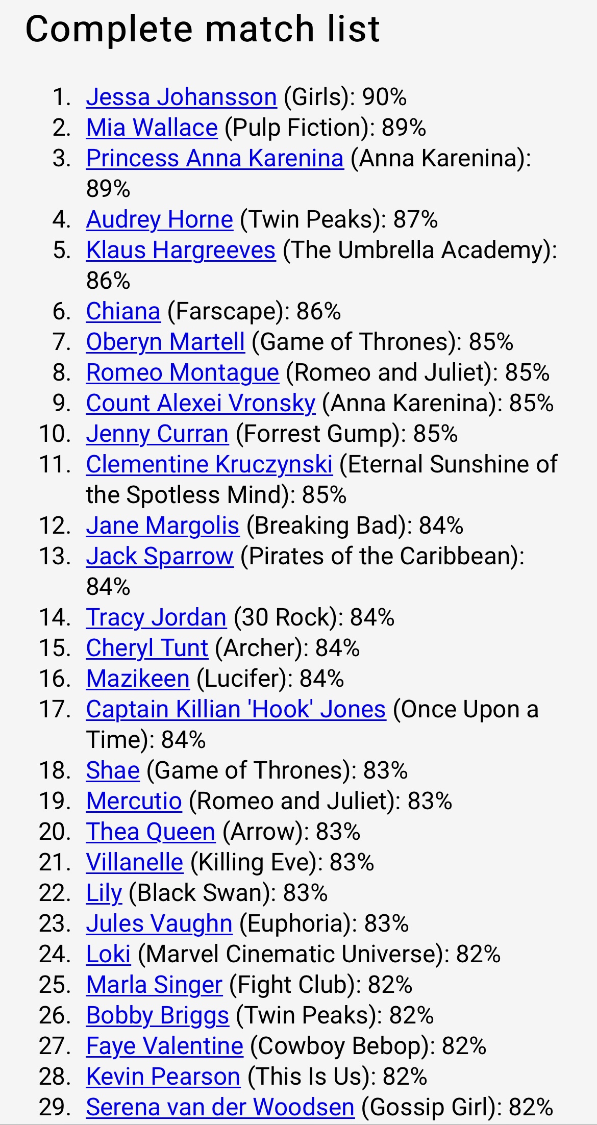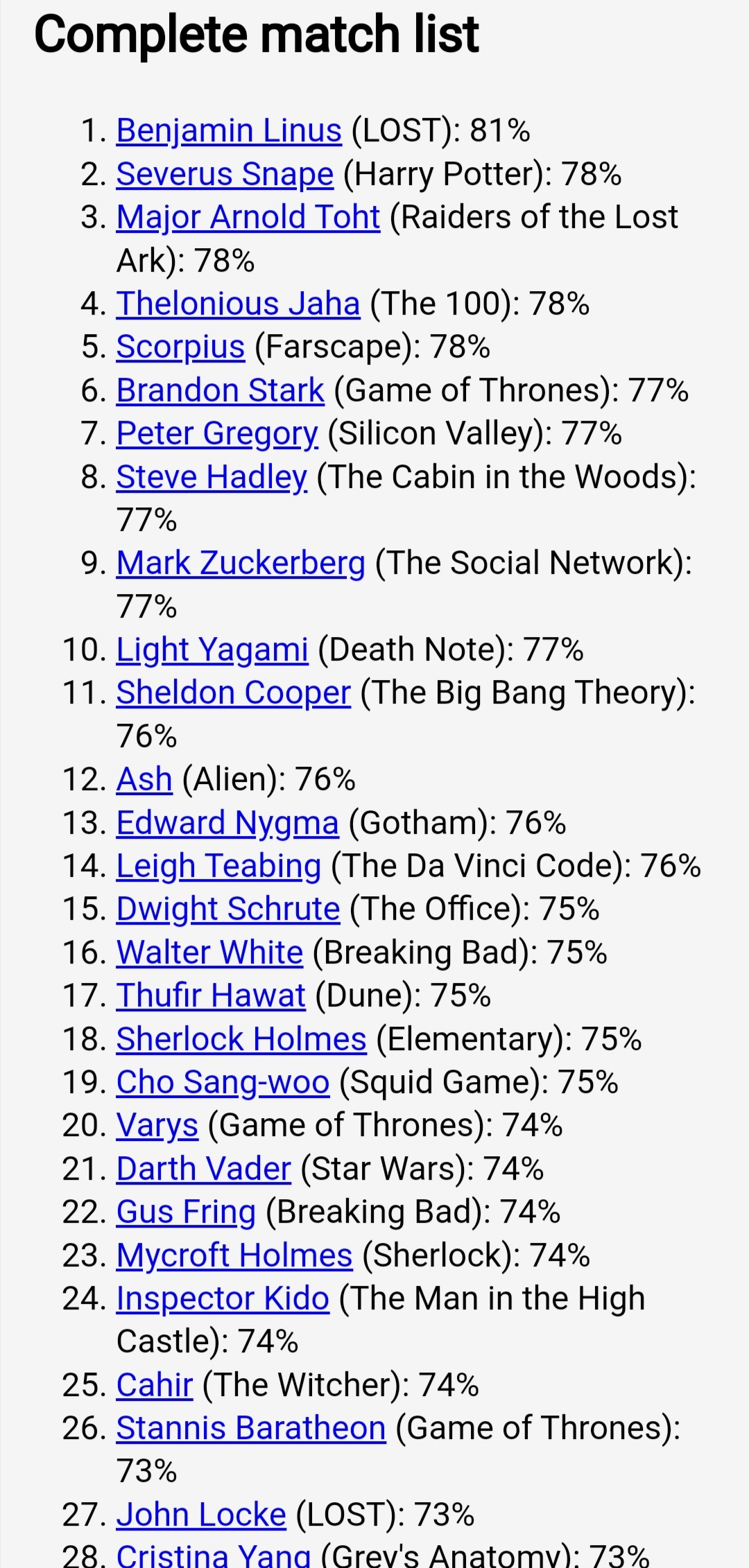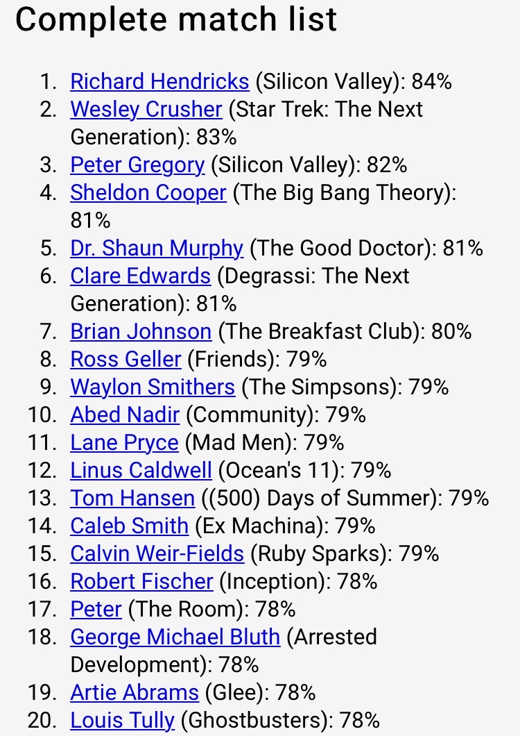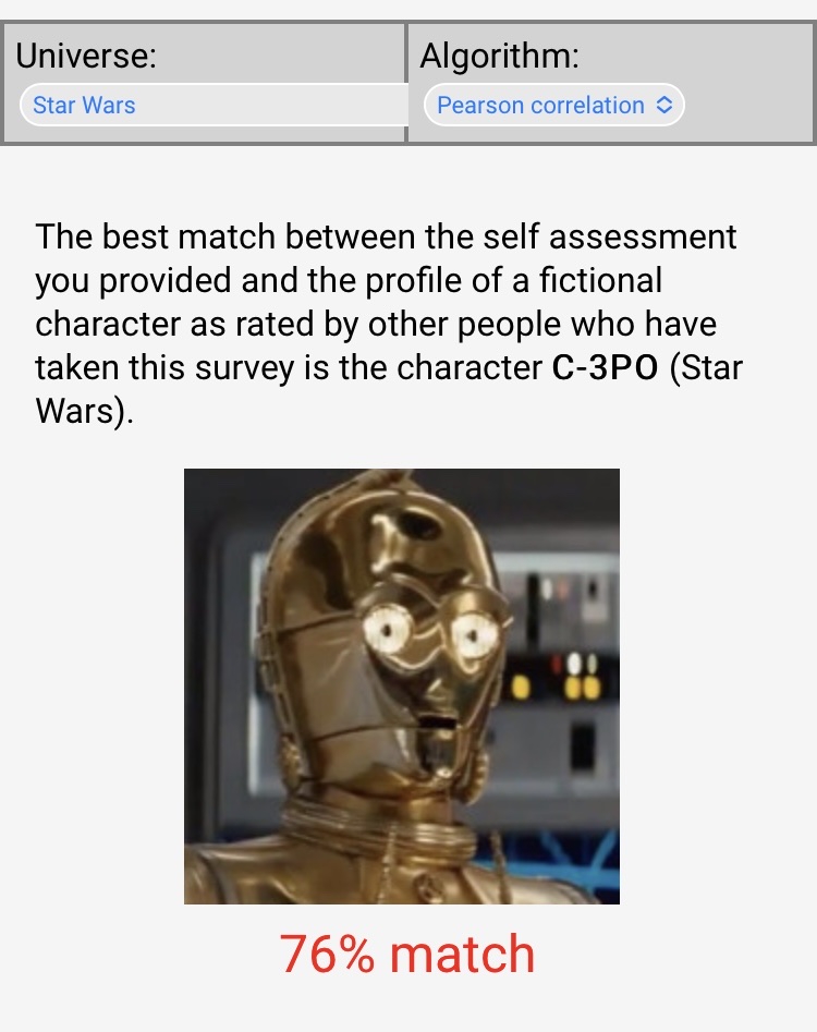 Для теста нужен хороший английский, он по каким-то своим метрикам определяет вашу схожесть с художественными персонажами. (можете выбирать как 36 вопросов, так и 100). Скриньте первые 10 или 20 результатов, будем обсуждать и ловить лулзы.