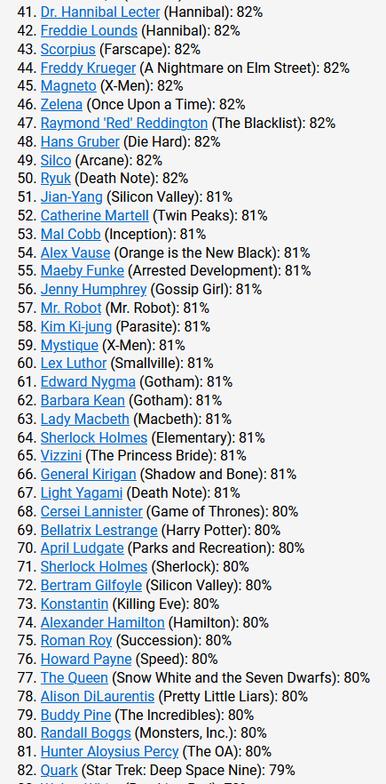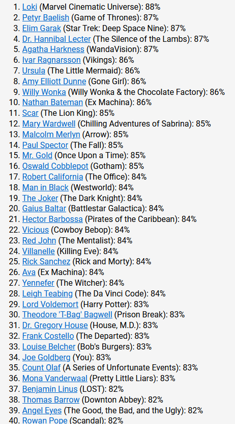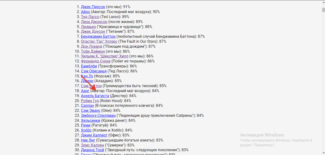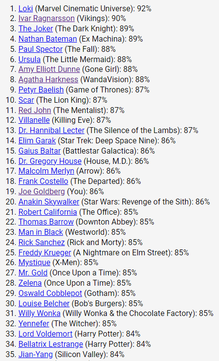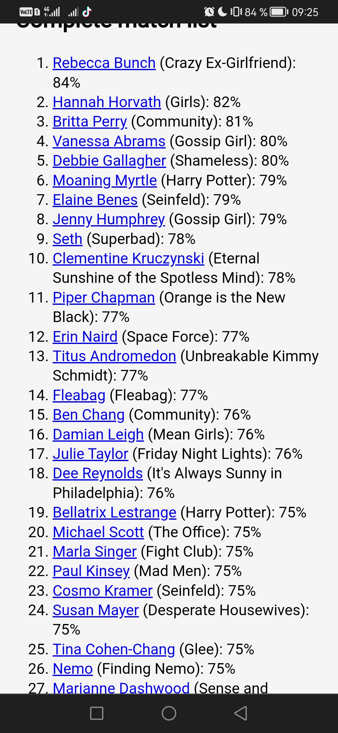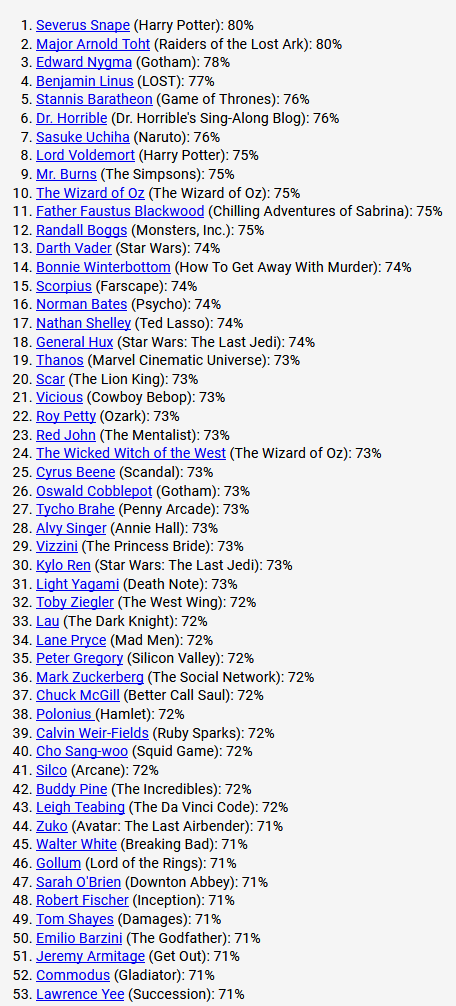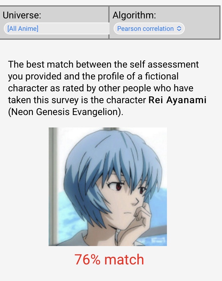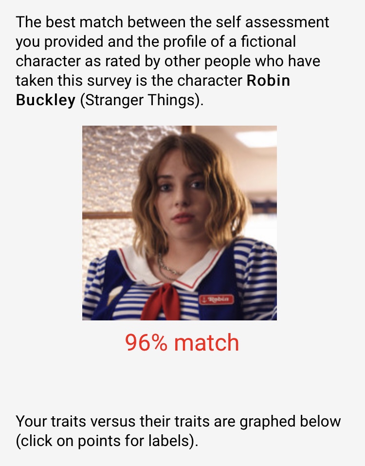 Для теста нужен хороший английский, он по каким-то своим метрикам определяет вашу схожесть с художественными персонажами. (можете выбирать как 36 вопросов, так и 100). Скриньте первые 10 или 20 результатов, будем обсуждать и ловить лулзы.