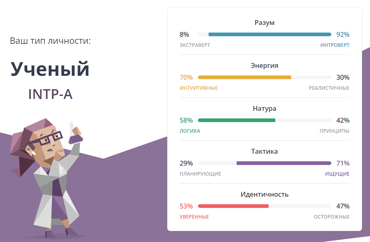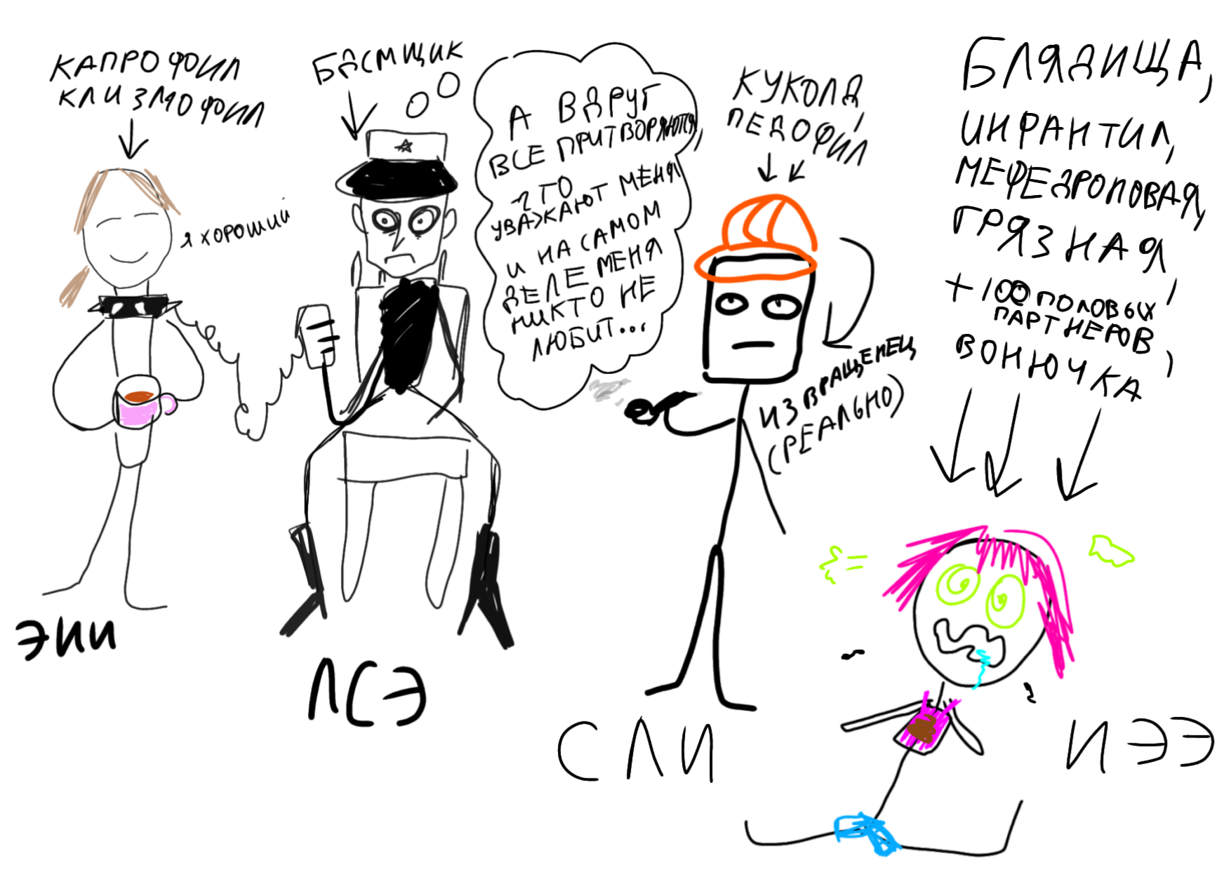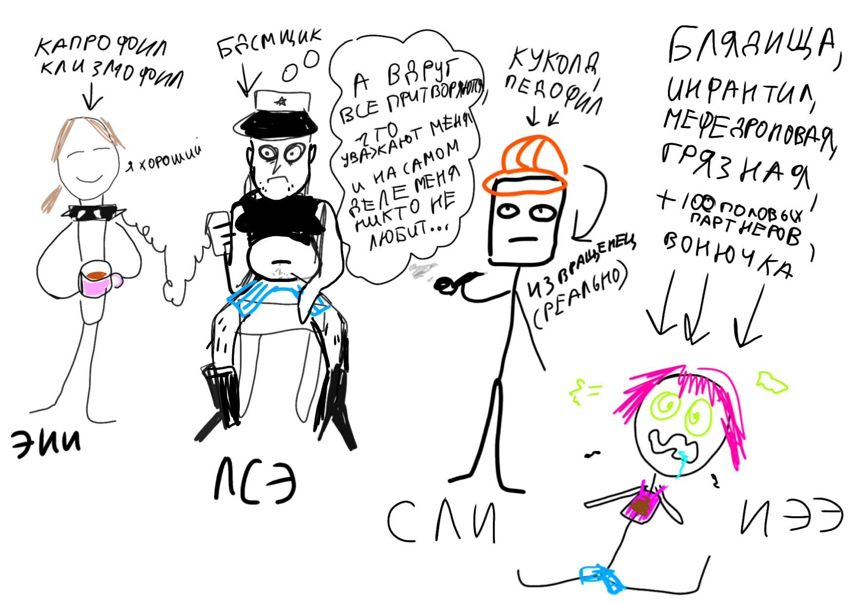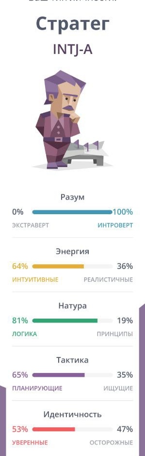 так хто я? в целом я придерживаюсь мнения что нельзя людей делить под одну калитку и в каждом человеке могут уживаться несколько типажей неважно чего именно в зависимости от ситуации, но тут мне уже пояснили что мои догадки в рамках соционики невозможны.