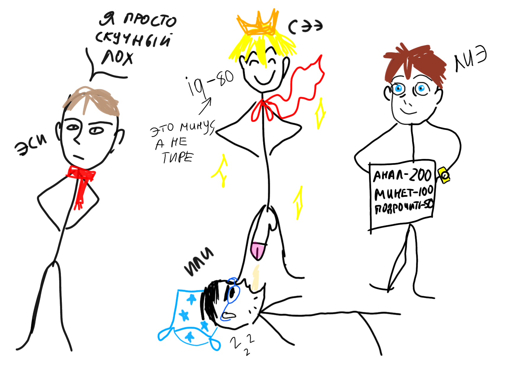>>189494 да я не привожу пример, я буквально цитирую написанное в соционических текстах и анализирую это взглядом не заинтересованного мимокрока. >бользад может в помойной яме лежать, но думать о своей финансовой империи тут стоит уточнить, думать об уже имеющейся империи или просто представлять? одно дело забивать на себя из-за более глобальных целей, а другое дело не иметь нихуя и только фантазировать. >Дюмас охуеет лежать не то что в помойной яме, а не на чистом белье или на каком то не таком матрасе, мечты не могут заглушить его дискомфорт в реале, а у бальзаков запросто могут. даже намёка на это не увидел за полчаса чтения различных источников, вот серьёзно, всё что я вычленил - то что он в силу своих комплексов пытается быть удобным для всех: вперёд толпы не лезет, особо своего мнения не выскажет, но всех выслушает, всем подскажет, всех развеселит.