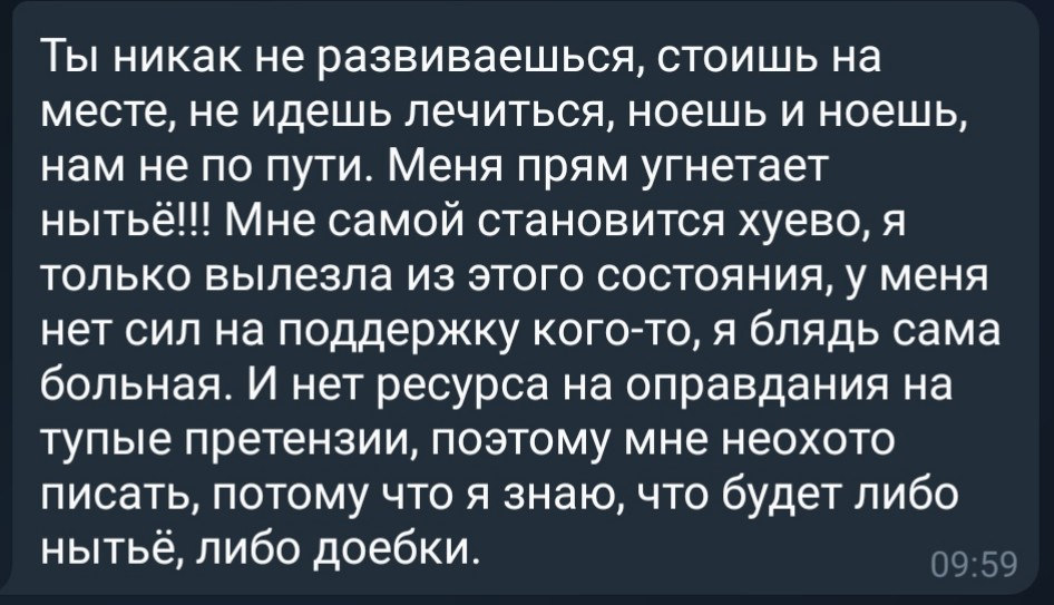>>188818 Был у меня опыт общения с тождественной. Влекло меня к ней пиздец как, но не устраивало то, что она шлюханствовать хотела. По этой причине она и заявила, что отношений со мной не хочет. Из всех попыток в отношения с ней было наиболее тесное физическое взаимодействие: обнимашки, полежать на коленках, если бы я не был тормозом, то засосал и трахнул бы. Понимание друг друга было с полуслова. Только вот Бальке не нужен Баль, ей нужен доминантный Нап. Если что, опыт общения с Напкой тоже был, и было это иначе, но похоже в плане понимания. Сейчас хочу себе Драйку найти, но почему то кажется, что проблема не в девушках, а во мне, и стоит навестить психолога.