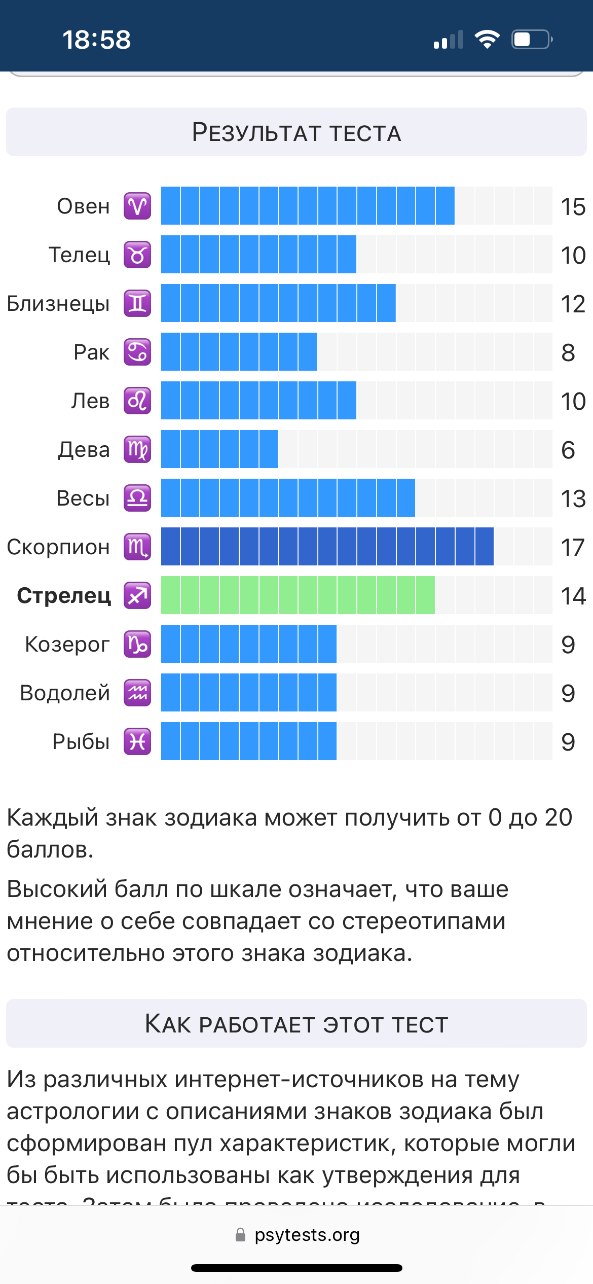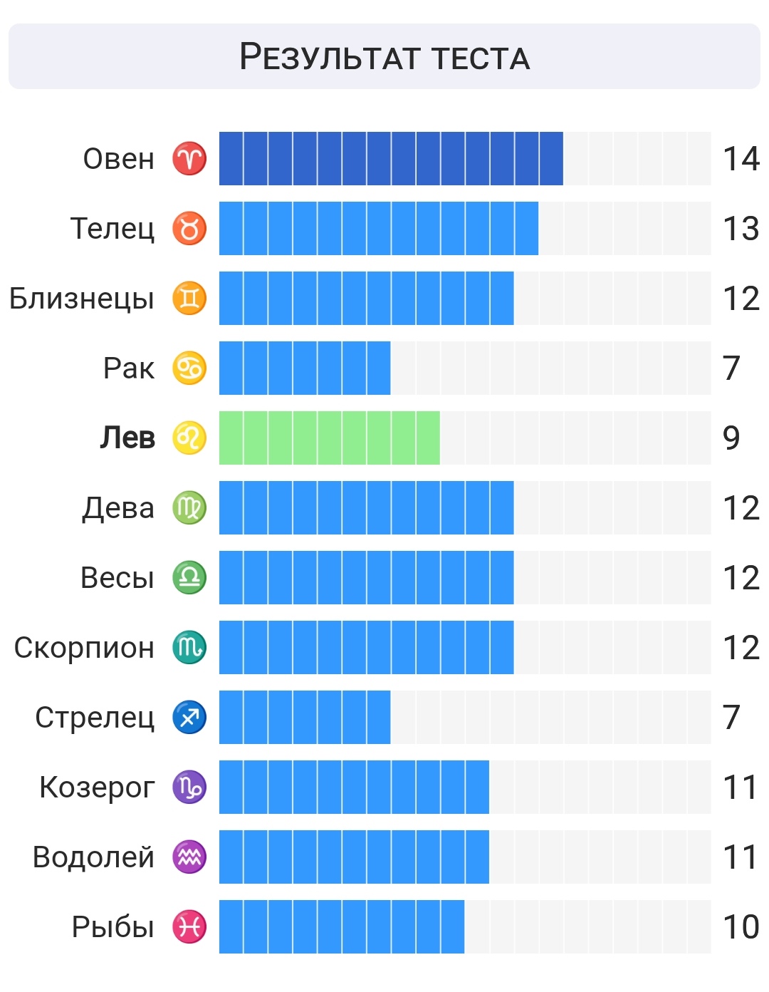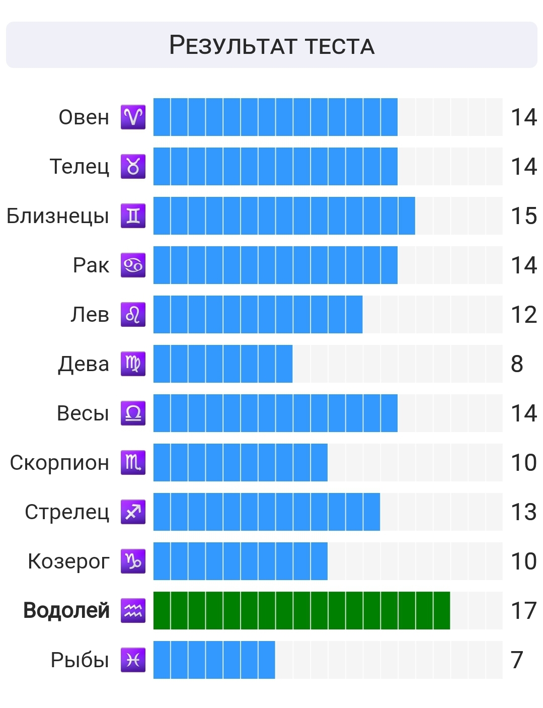 вы нахуя это делаете? тест по гороскопу проходят на доске соционики.. не надо тогда удивляться, что у нормисов к соционике отношение как к гороскопам, даже хуже. да, есть на доске несколько припизднутых, которые просто обмазываются любыми говнотестами и высирают эти треды завлекая других, но зачем опускаться до их уровня?