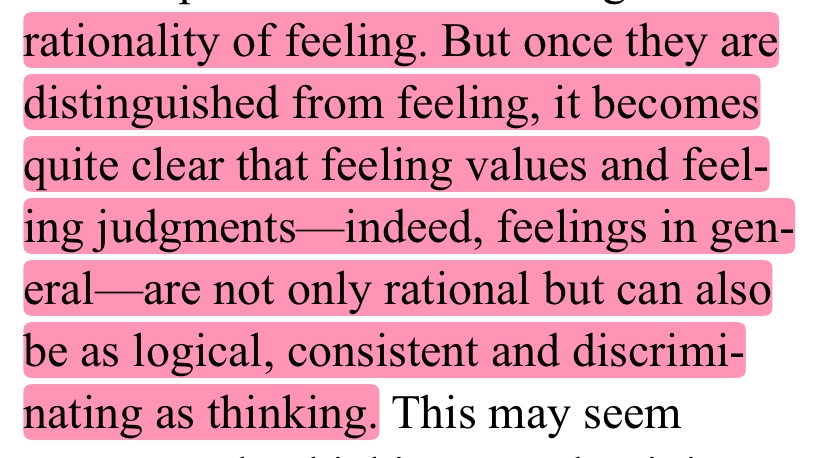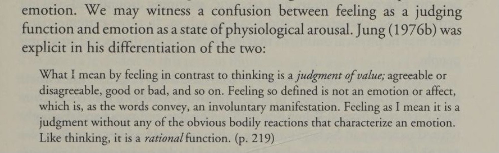 Юнг: Чувство, как я имею в виду, — это суждение без каких-либо очевидных телесных реакций, характеризующих эмоцию. Как и мышление, это рациональная функция.
