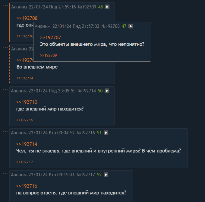 >>192797 >Есть люди, которые не могут провести такое разделение, они, например, не могут свои галлюцинации отличить от реальности. Если ты из таких людей, то советую обратиться за помощью. я уже понял, что твоё призвание это раздавать советы. но давайте вернёмся от женских хамских манипуляций к конкретике. вышенаписанное не является ответом на конкретный вопрос - где находится внешний мир.