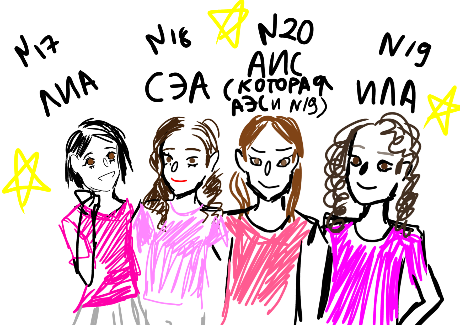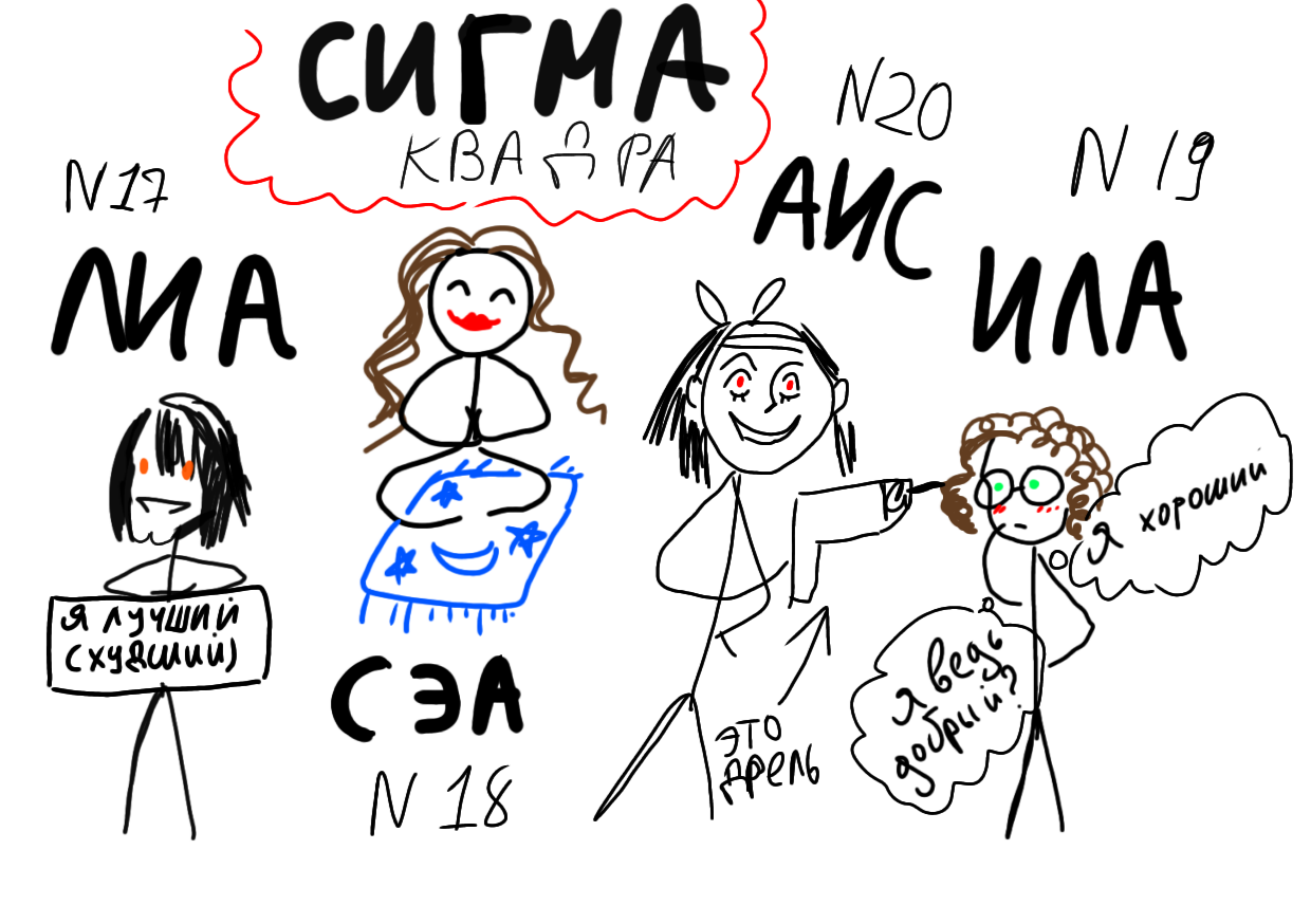 Общительная, добрая хуйня. Глупая, но стремится к знаниям. Бьет себя в грудь, что человек науки. В целом за амбиции лайк и добивается неплохих результатов. Хорошо рисуют(ебать а вдруг я всё-таки АИС ну из одной квадры как никак, В СИГМА КВАДРЕ КСТА ВСЕ ДРУГ ДРУГУ ДУАЛЫ)