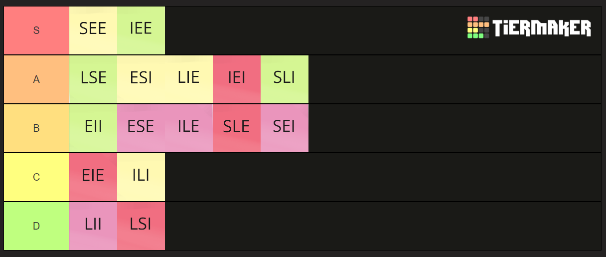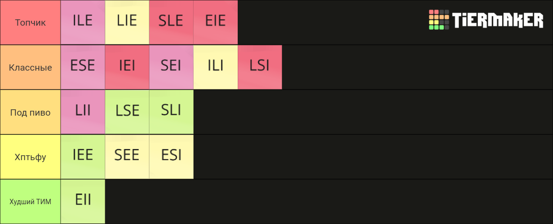 СЛИ Умные, заботливые, спокойные, в большинстве случаев надёжные. Но при этом лишены оригинальности. Такие типичные нормисы. Умеют много чего делать именно руками, разбираются в технике. При всём при этом бывают мнительны, БЭ слегка странновата, бывает полный неадекват по этой функции. Эмоциональность дверной ручки, но на это мне лично всё равно, хоть и бывает скучно. В целом, ничего прям плохого сказать не могу.