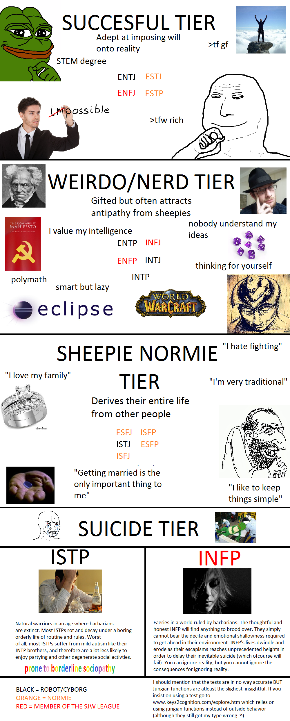 >>207710 >и верные супруги Это частое заблуждение. Сенсорные рационалы не только традиционалисты в христианском плане, но и в контексте всего нормального. Поэтому от них и услышишь народное "хороший левак укрепляет брак" и прочие золотые стандарты.