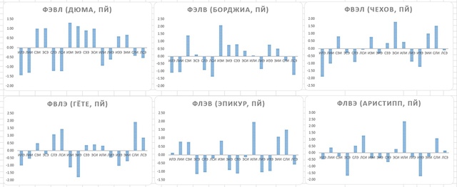 И пусть творческая у них разная, однако в их поведении в обществе, по крайней мере в зафиксированных описаниях их поведения при жизни, вероятно было наиболее заметно различие БЛ и БЭ. Следовательно опираясь на эти данные и сделана привязка известных реально существующих персонажей к буквенному обозначению социотипа.
