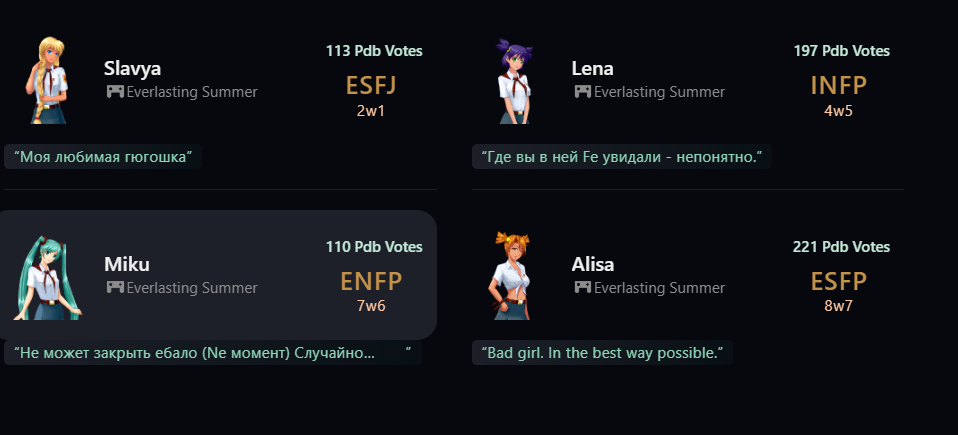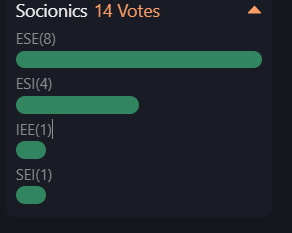 >>202011 >Ульяна Логик-экстраверт >ольга дмитриевна Рационал-этик >славя Точно рационал-сенсорик, экстраверсию выше аргументировали Как минимум две дихотомии у них угадал