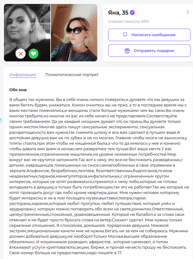 Могу рассказать про него кратко: в целом оказывает приятное впечатление мыслящего, эмпатичного человека с твердыми убеждениями и принципами. В компании хорошо смешно шутит, но иногда может над кем-то не по доброму, то есть может подъебать, но лидирующих позиций в компании не занимает. Заметила, что какой-то резко реагирует на просьбы что-то подержать, например, то есть не хочет выглядеть "опущенным", бегунком в глазах других, лол. Флиртует открыто со мной только на публике, наедине гораздо скромнее, просто болтаем без юмора на довольно глубокие темы. Не тревожен и спокоен, есть лёгкий элемент распиздяйства. Приветствует больше коллективиз, а не индивидуализм. Дома у него такой бедненький минимализм, но чисто. Готовит и выглядит сносно, опрятен, старается правильно питаться. Любит выпить и покурить. Встречался и жил до этого с девушкой логиком-рационалом неопределенного социотипа, знаю от знакомых, что не стремался занимать у нее деньги. Может иногда выдать что-то типа "с милым рай в шалаше". Короче ЧЛ невысокая. Склонен к некоторому морализаторству.