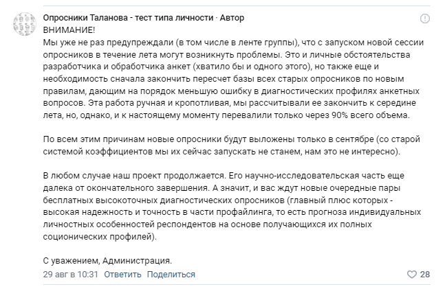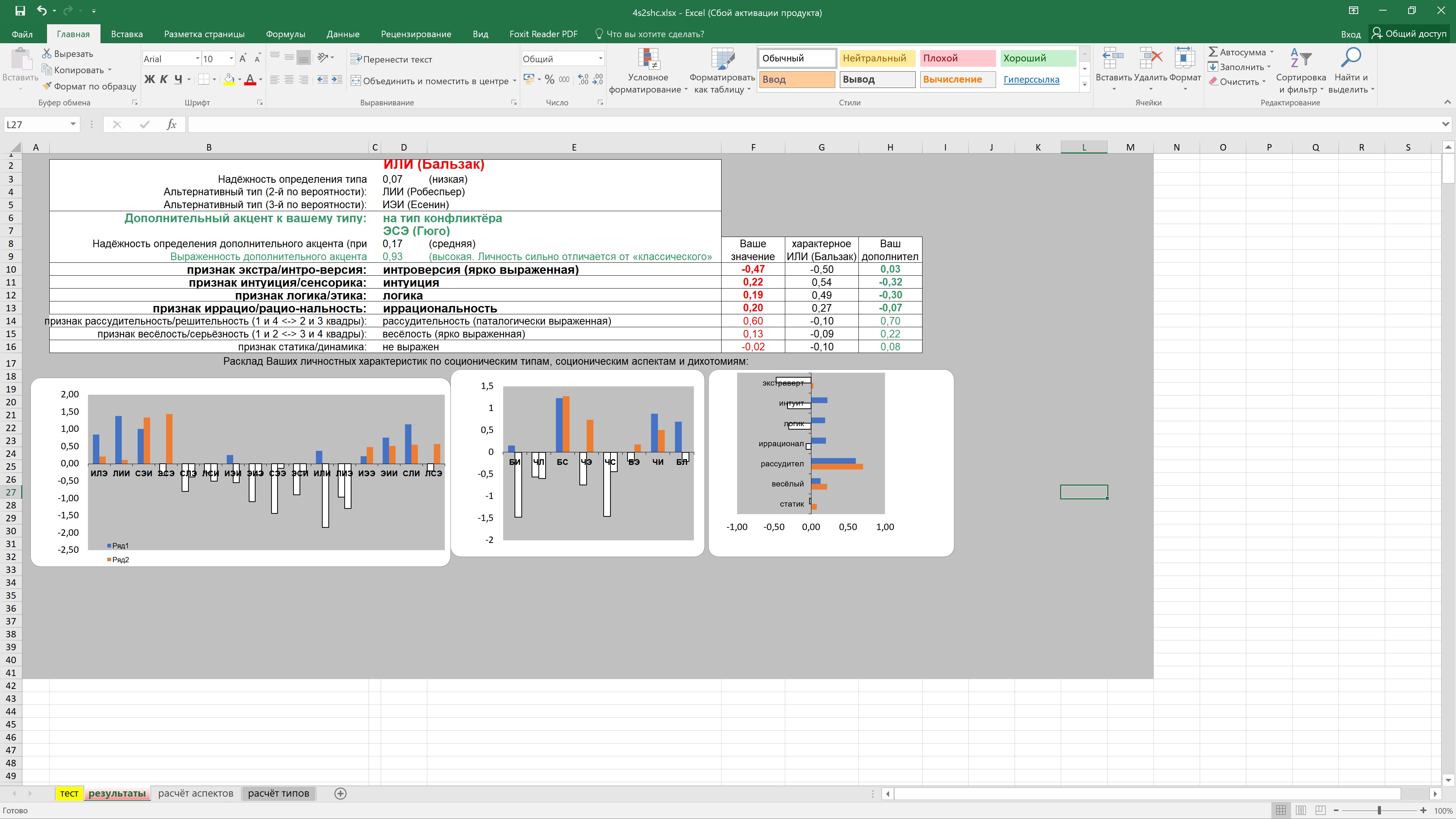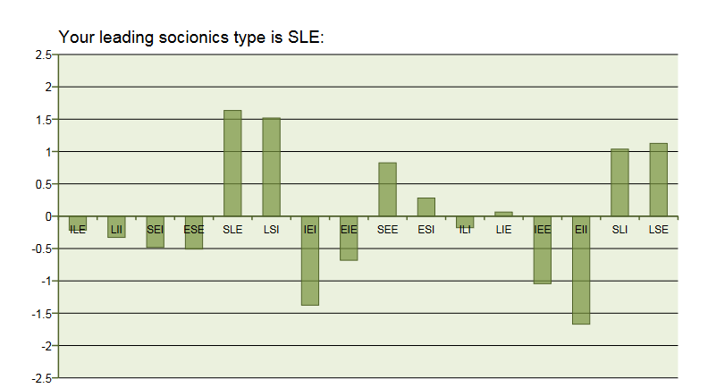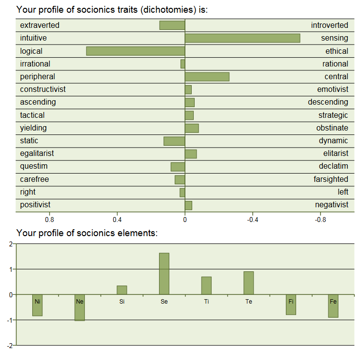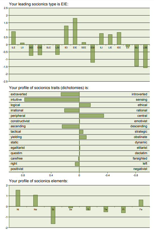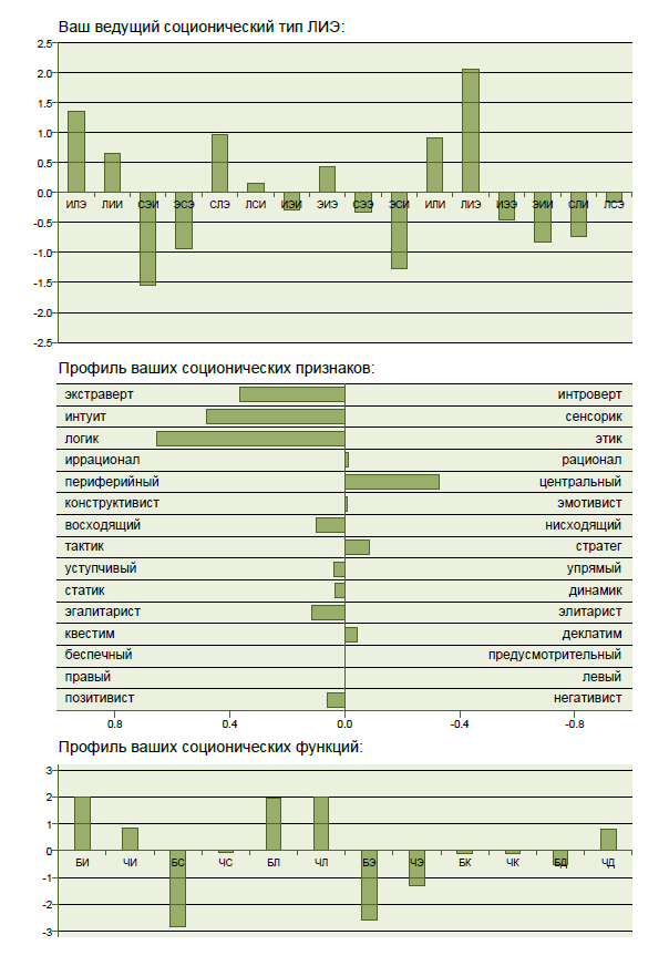 В тесте отсутствует психологизм, это просто сборник туповатых вопросов на функции (предугадать, что к чему относится, очень легко), стереотипов и общих фраз. Прикрепляю свой результат, чтобы вы поняли весь аутизм автора. ИЛИ ЛЭВФ