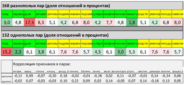 Дуальные отношения с отрывом от прочих лидируют по популярности среди разнополых пар (это касается и близких, и дружеских, и даже родственных отношений, но у близких отношений контраст выражен сильнее). Напротив, в однополых парах дуальные отношения по частоте занимают среднюю позицию, а доминируют тождественные отношения. И это снова касается как близких, так и дружеских, и даже родственных пар.