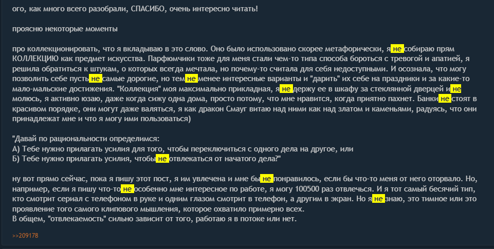>>209165 >Коллекционирование - действие, причина действия может быть разной, Просто ты не знал значение слова коллекция и думал, что коллекционировать это просто собирать какие то предметы. Есть нейтральные слова, которые можно отнести в разные функции например слово "деньги" может быть как символ расчёта в аспекте БЛ, так и способом весело провести время по ЧЭ, или знак прибыли в ЧЛ. Есть выражения по БЛ например "из за того, что", это выражение не может быть на какую либо другую функцию. А вот слово время например, употребляется не только функцией БИ, но если это будет допустим "Упустил момент", то это именно функция БИ говорит, и не важно в каком контексте, даже если упустил момент и не вытащил пирог из духовки. Любое предложение человека состоит из слов или словосочетаний по разным функциям, даже по болевой, но процентное соотношение употребления этих всех слов и словосочетаний будет соответствовать силе функций у типа. У неё допустим явно БЛ сильная (если судить по этому короткому отрывку) так как помимо слова "коллекционировать" есть ещё и "в связи с тем, что", "потому, что", которые указывают на объяснение с точки зрения БЛ, или слова выражающие меру и степень что из чего следует. Так же внимание уделяется действиям (ЧЛ), кто что делает: "иду домой и думаю", тут 2 действия, "зацепился и говорит" тут тоже 2 действия, есть слова "упорно", "решительно", это слова по ЧС. Больше всего слов по БИ: момент, тогда, когда, никогда, давно, много лет.. А вот БС только в слове "заботиться" прозвучало. "люблю делать" это ЧЛ кстати и не важно, что макияж, макияж это не БС а нейтральное слово.