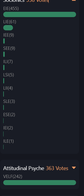 Что думаете насчёт этой статистики? Лично я думаю, что у ж*нщин ISFP и ESFP всё-таки повыше, чем xSFJ, а количество Джечек несправедливо занижено, но вообще выглядит правдиво. У мужчин как-то дебильнее - не может быть такого количества Дюм и Максонов, а Гюгоха распространённее Напа это кек и лол. Джечок опять же где-то внизу, хотя это каждый второй пацанчик с района.
