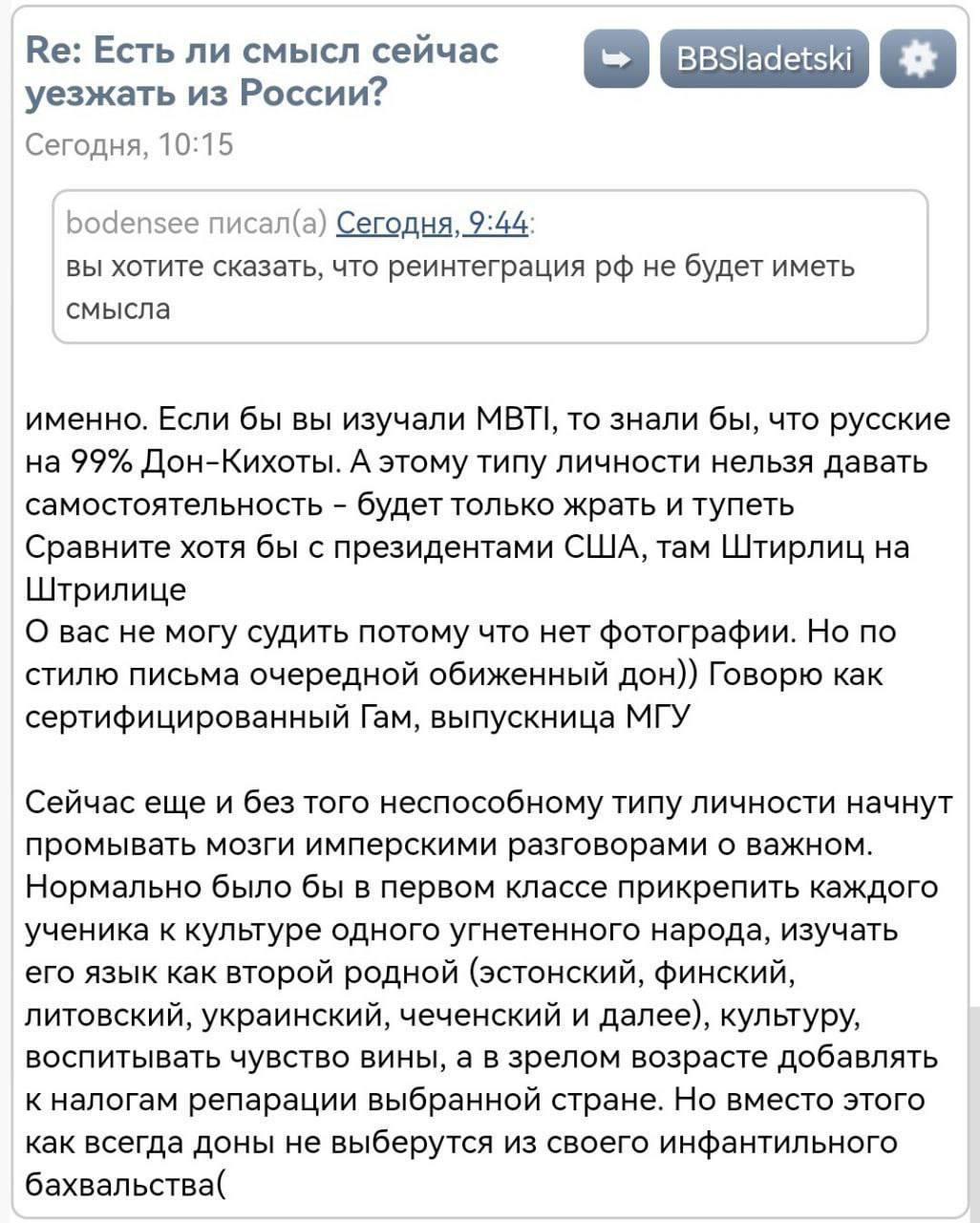 >>214807 >А Дончику с суггестивной БС она обычно очень даже интересна Не так интересна как активационная и по силе она почти как болевая, так что он по ней ничего не говорит сам, потому что не может из за её слабости. По суггестивной хочется чтобы тебе просто помогли без лишних слов. >Сенсорика в литературе проявляется в душных описаниях каждой травинки и околонулевой абстрактности. Это у сенсорных логиков. А если брать сенсорных этиков, то это уже Арсен Маркарян.