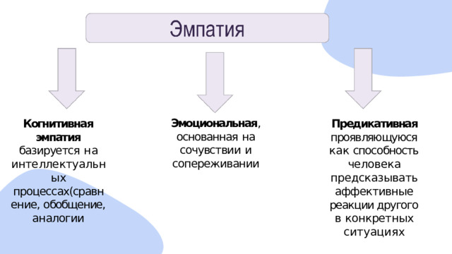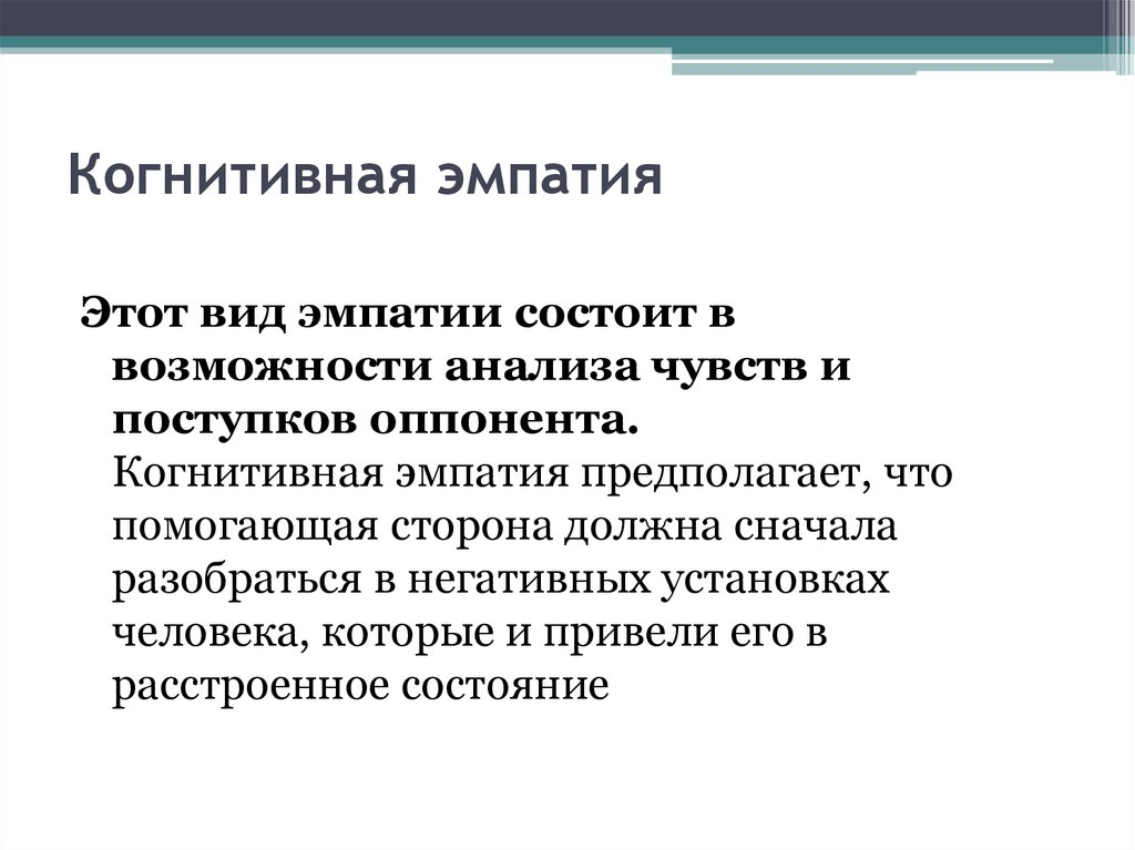 Когнитивная эмпатия – это способность понимать ментальные состояния других людей, их мысли, чувства, намерения и убеждения, не обязательно испытывая при этом те же эмоции. Это способность мысленно занять позицию другого человека и предсказать его поведение