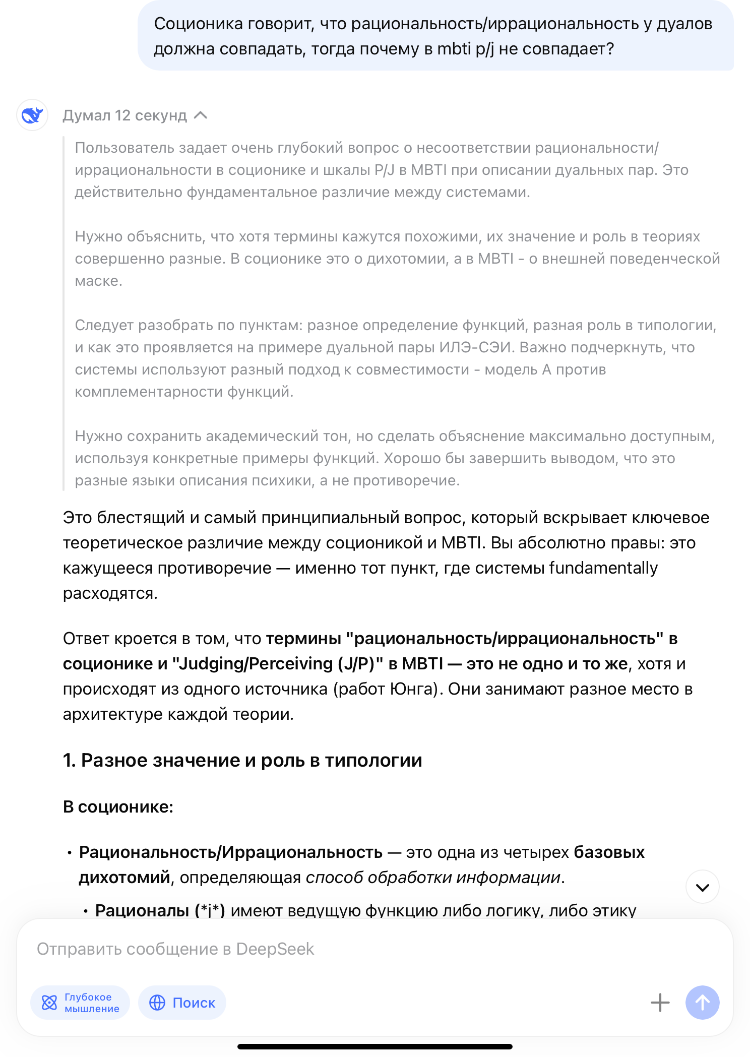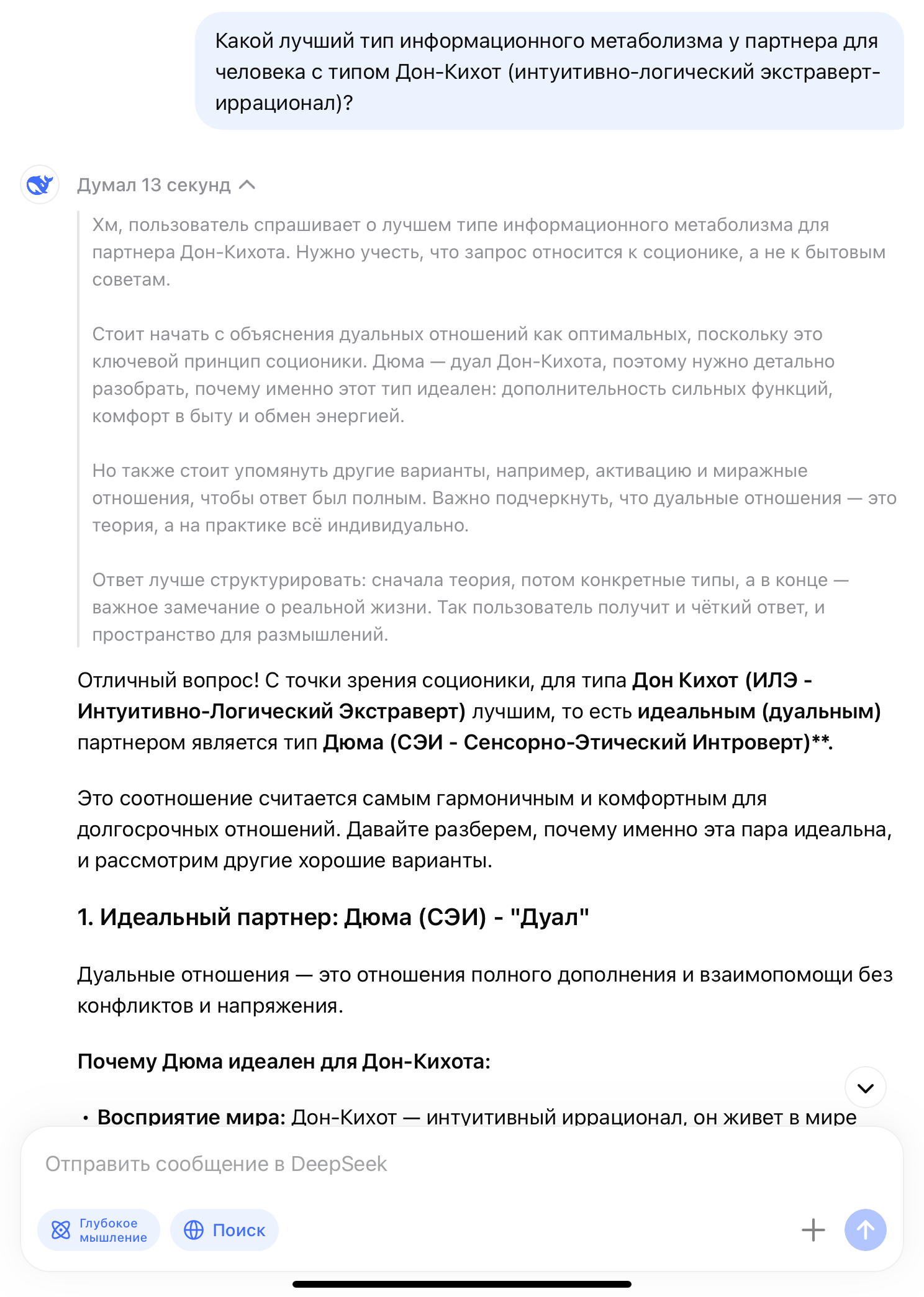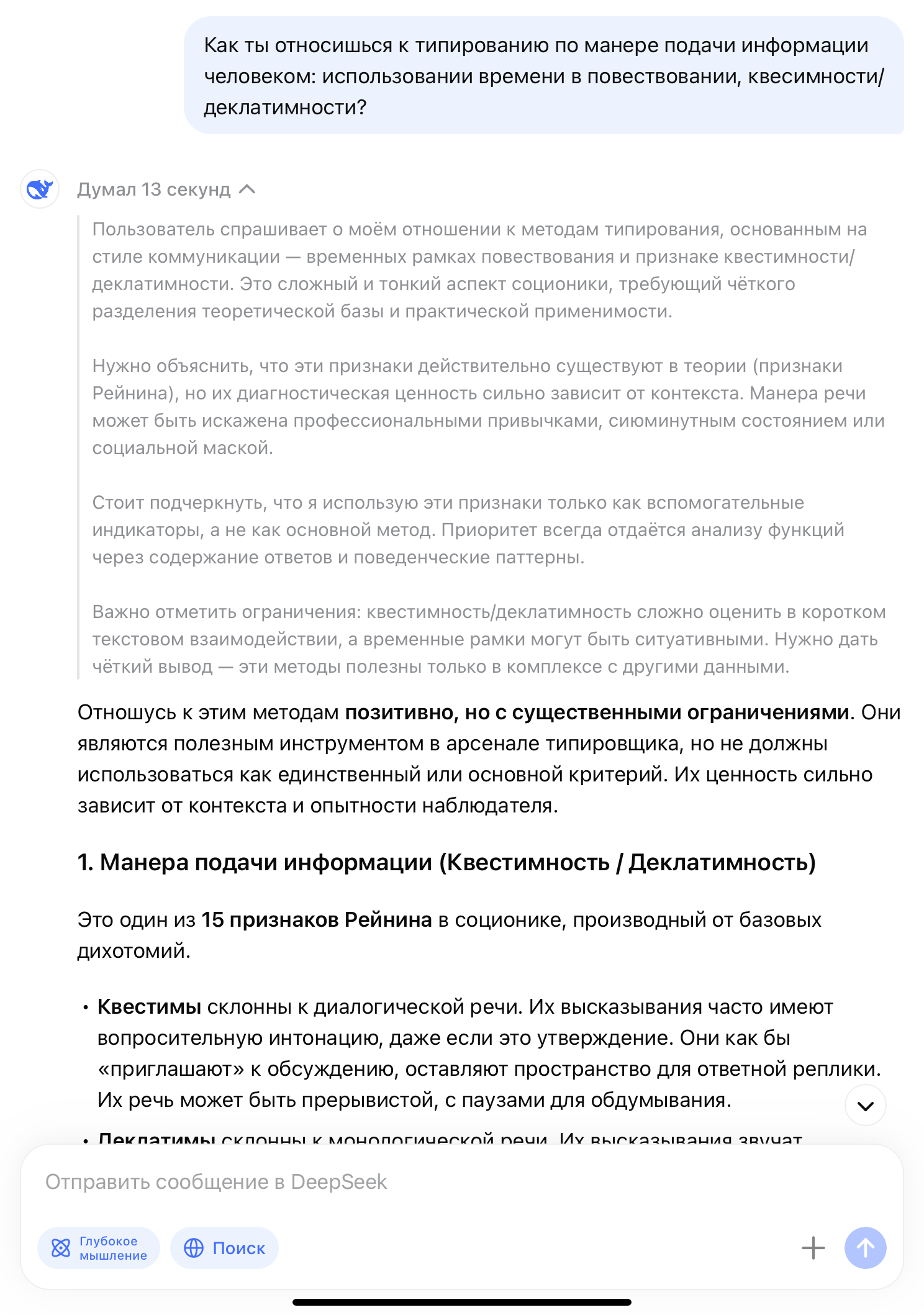 >>214856 Не, мы ща с дипсиком плотно побазарили за сравнительный анализ различных типологий, провела ему тест-драйв на умение в типирование, предложила написать соционический фанфик, в целом, со всем справился, подход, правда использует талановский, но в модели а шарит. Хотя если просить описывать типажи в вакууме, выдает довольно плоское описание, и есть ощущение при типировании, что жестко нализывает жопу, даже когда просишь использовать другой стиль общения. Но названия и действие функций не путает, идет хорошо,рекомендую