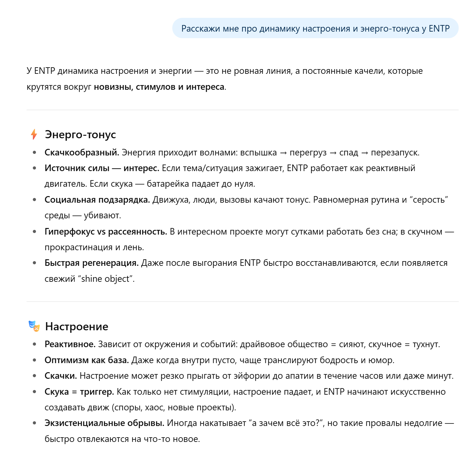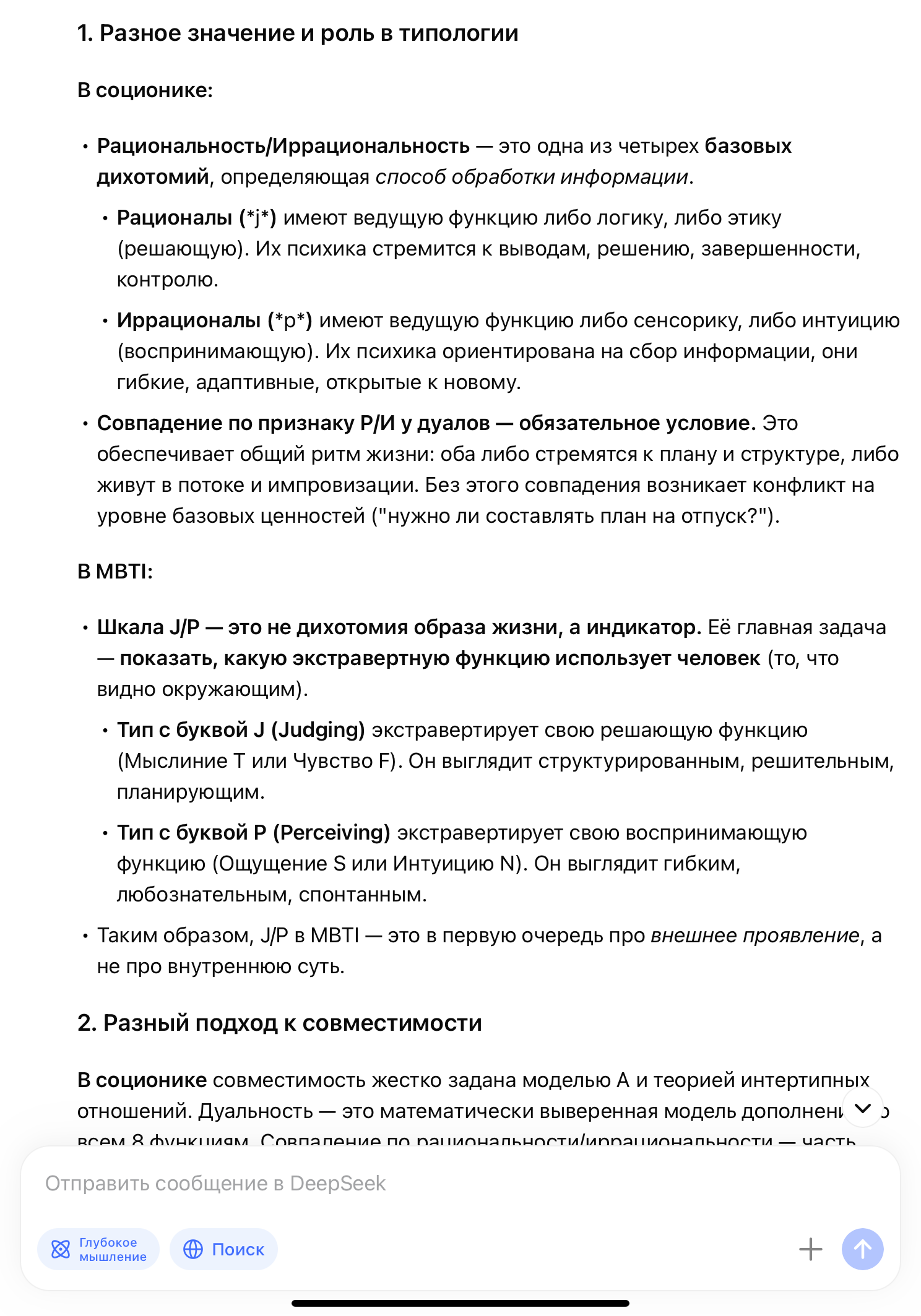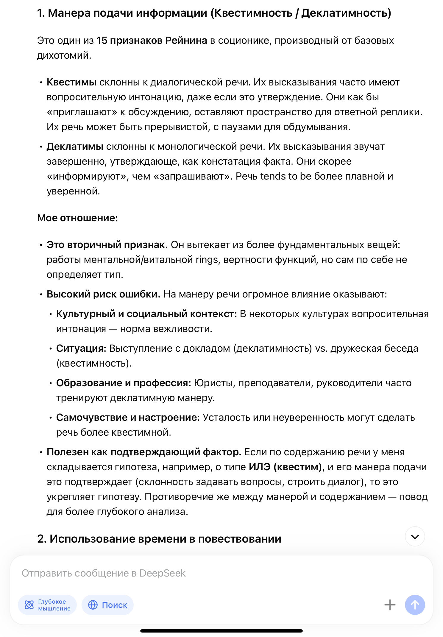>>214856 Не, мы ща с дипсиком плотно побазарили за сравнительный анализ различных типологий, провела ему тест-драйв на умение в типирование, предложила написать соционический фанфик, в целом, со всем справился, подход, правда использует талановский, но в модели а шарит. Хотя если просить описывать типажи в вакууме, выдает довольно плоское описание, и есть ощущение при типировании, что жестко нализывает жопу, даже когда просишь использовать другой стиль общения. Но названия и действие функций не путает, идет хорошо,рекомендую