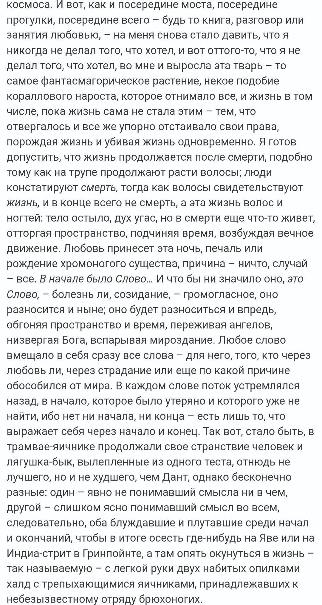 >>214719 >Чтобы кто-то ирл настолько упарывался в отношения - я не встречала Я наоборот вижу у людей вокруг повальную одержимость отношачем сколько себя помню, из-за этого не в последнюю очередь долго считал себя каким-то нитакусей ни в ту сторону. >Дон, как известно, самый интровертный из экстравертов Понятно чего я в бальзамов типировался несколько раз. >Вот вы встречаетесь, узнали друг друга, достигли комфортного уровня доверия - тут бы и законсервироваться Ну блин так-то, хуманы ради совместного быта, ипотек и главное то что - бридинга пары образуют. >Для того, чтобы увлечь зрителя и раскрыть персонажа, надо показывать эмоции, и тут лучший кандидат - именно влюбленность Это вообще хардовый пиздец и один из самых жестоких абсурдных трюков который современная культура делает с мозгами людей: ебовую вечно эскалирующуюся ДРАМУ отношений героев во влажнейшем из искустов - нужную просто потому что законы драматургии так работают / чтобы удержать внимание зрителя - мы берём и инсталлируем в психику нормисов как образец того, что такое романтическая динамика в отношении полов. А дальше эта хуйня метастазирует, вплоть до того, что существенному количеству (в основном, имхо) тянок становится скучно от уютного спокойного быта и нужна постоянная эмоциональная волатильность и фейерверки какие-то ебаные в отношениях - иначе НЕ ТО, ето явно нилюбовь раз не ебашит драм движок в отношениях!