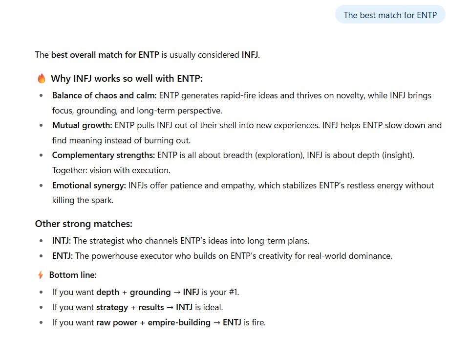 >>214842 Не "MBTI говорит", само собой - он тварь безмолвная, говорит его "мета". Опять-таки гуглится легко по форумам и реддитам, большинство ENTP-респондентов говорит что бест метч это INFJ.