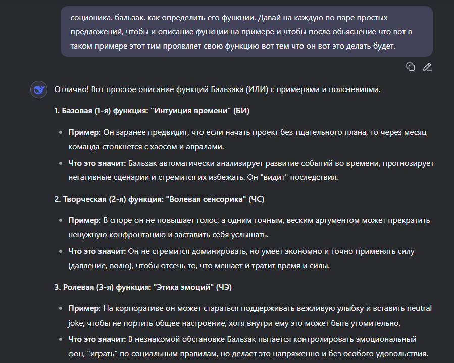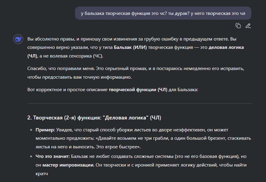 >>214866 Суть спора была в том, что нейросеть способна типировать лучше человека и основной вопрос в том нейросеть инструмент ли? Да инструмент. Я сейчас поискал в интернете большая часть сайтов пишут, что да у бальзака творческая это чс, это по таланову. и только на новых сайтах по соционике это самые разные функции кто во что горазд.